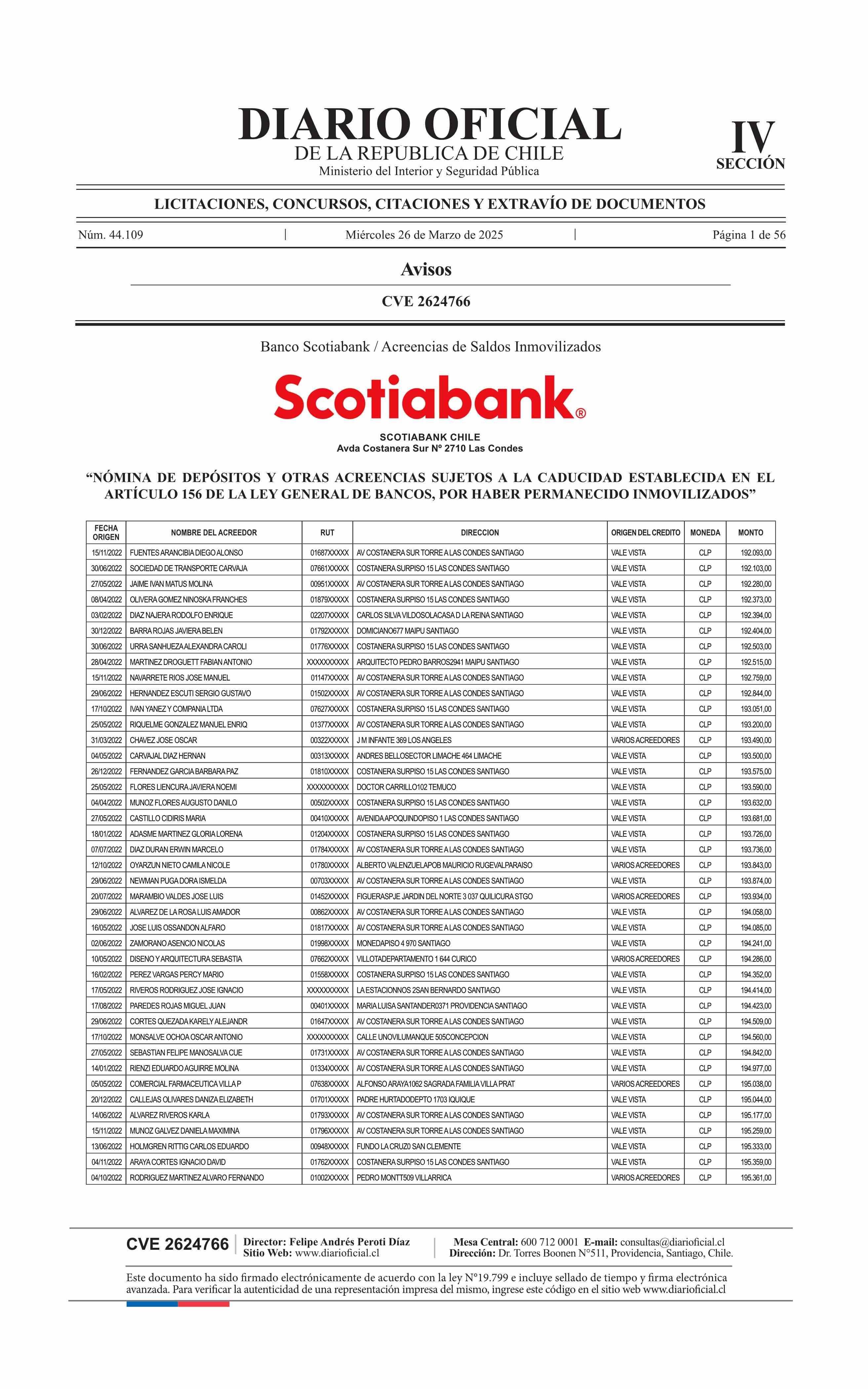 | Título: | AVISO LICITACIONES: SCOTIABANK: Nómina de depósitos y otras acreencias sujetos a la caducidad establecida en el artículo 156 de la Ley General de Bancos, por haber permanecido inmovilizados |