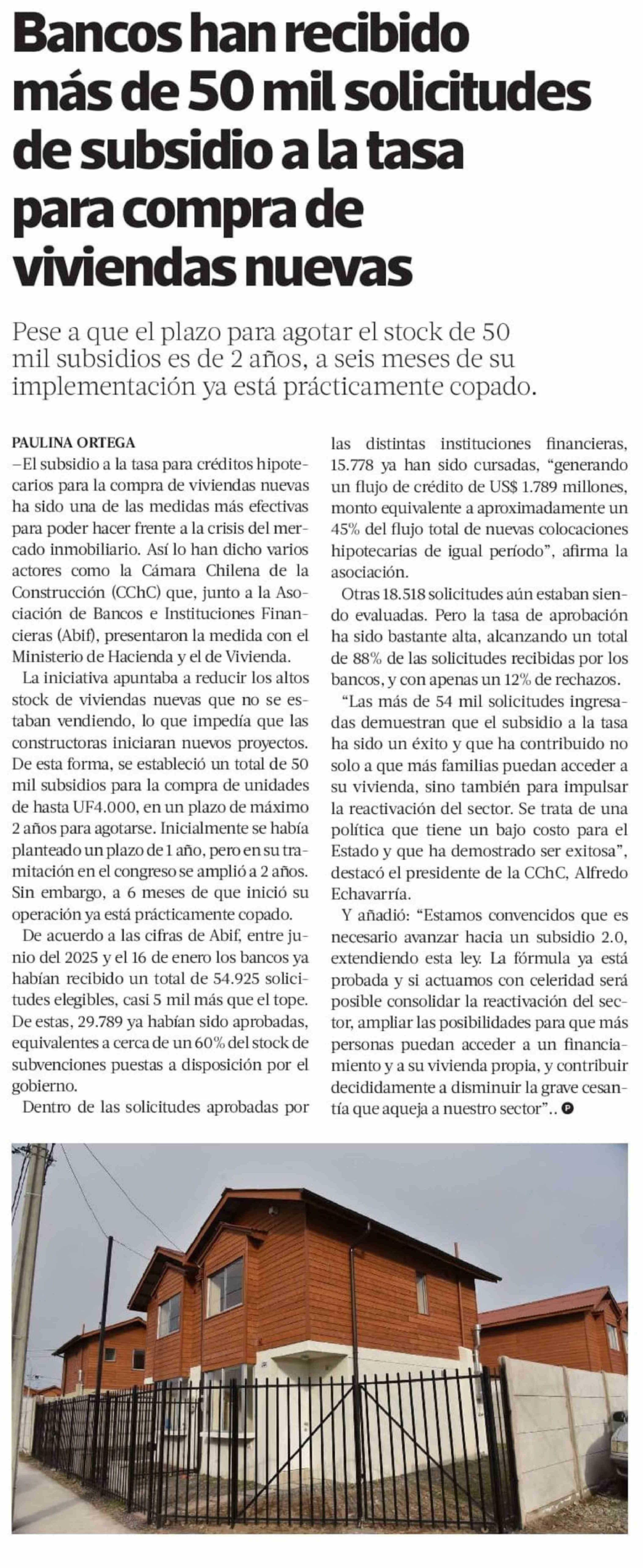 Bancos han recibido más de 50 mil solicitudes de subsidio a la tasa para compra de viviendas nuevas 04-02-2026 La Tercera |