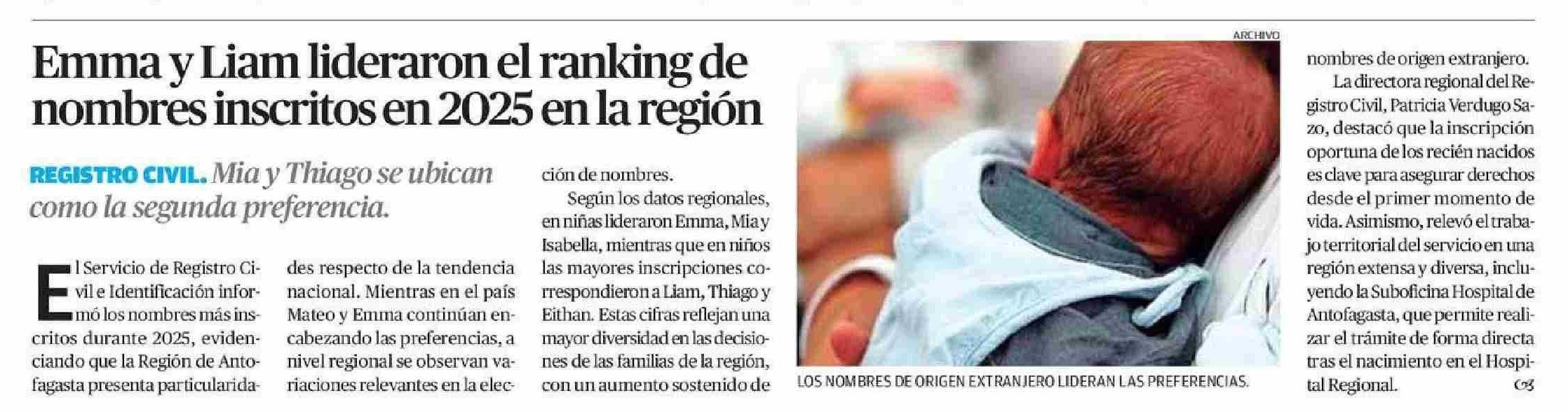 Título: Emma y Liam lideraron el ranking de nombres inscritos en 2025 en la región