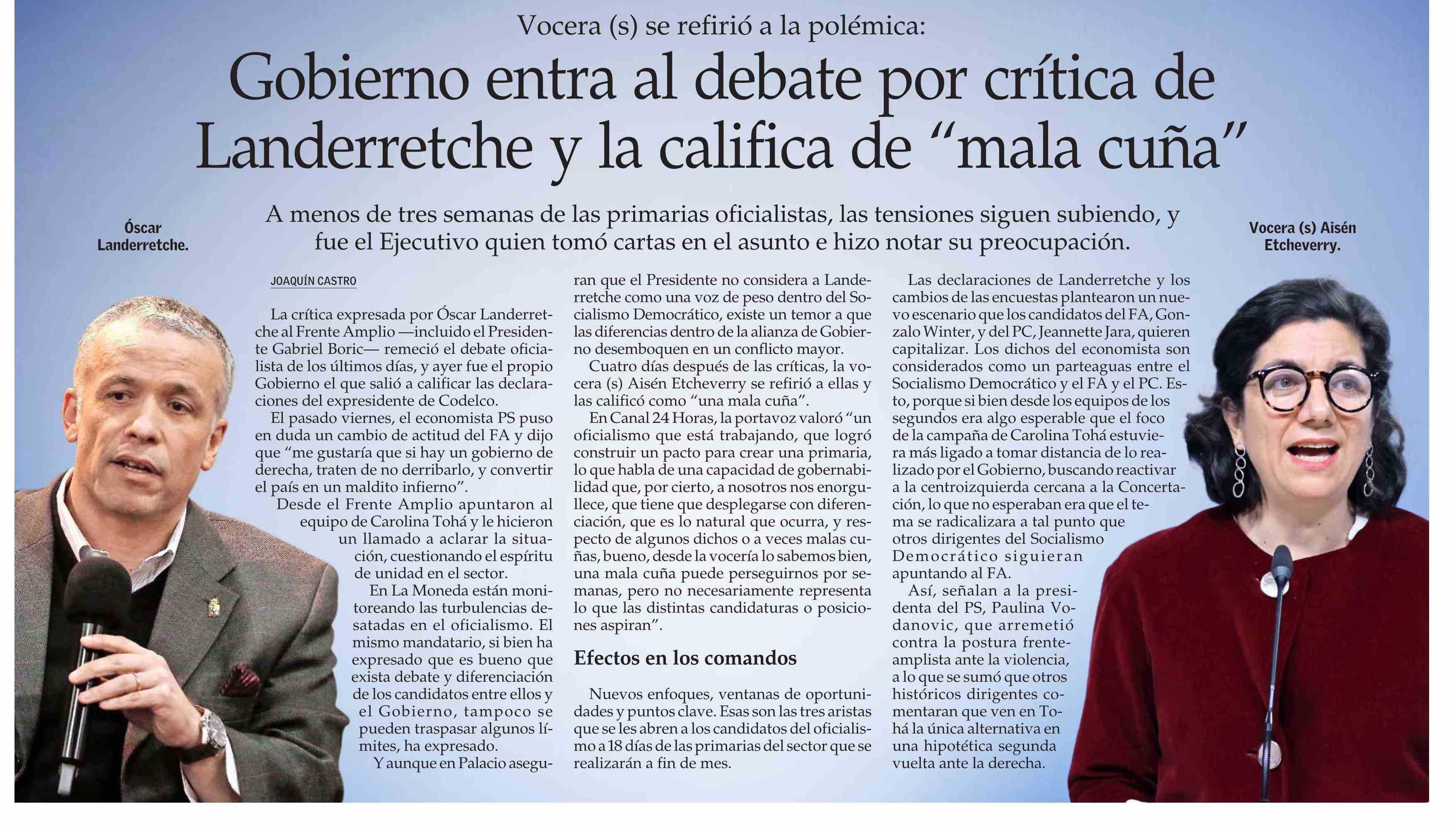 | Título: | Gobierno entra al debate por crítica de Landerretche y la califica de “mala cuña” |