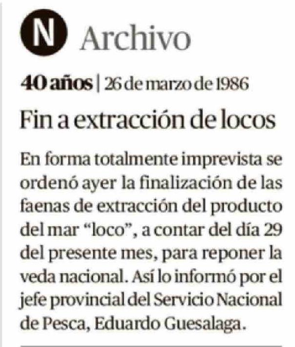| Título: | 40 años | 26 de marzo de 1986 Fin a extracción de locos En forma totalmente imprevista se ordenó ayer la finalización de las faenas de extracción del producto del mar "loco", a contar del día 29 del presente mes, para reponer la veda nacional. Así lo informó por el jefe provincial del Servicio Nacio |