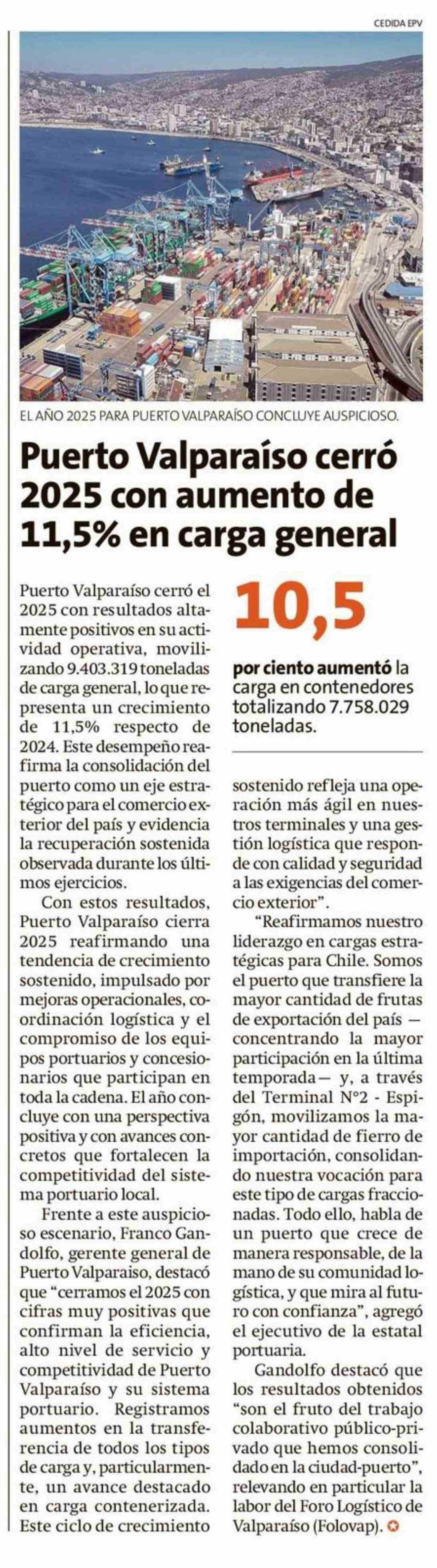 | Título: | Puerto Valparaíso cerró 2025 con aumento de 11,5% en carga general |