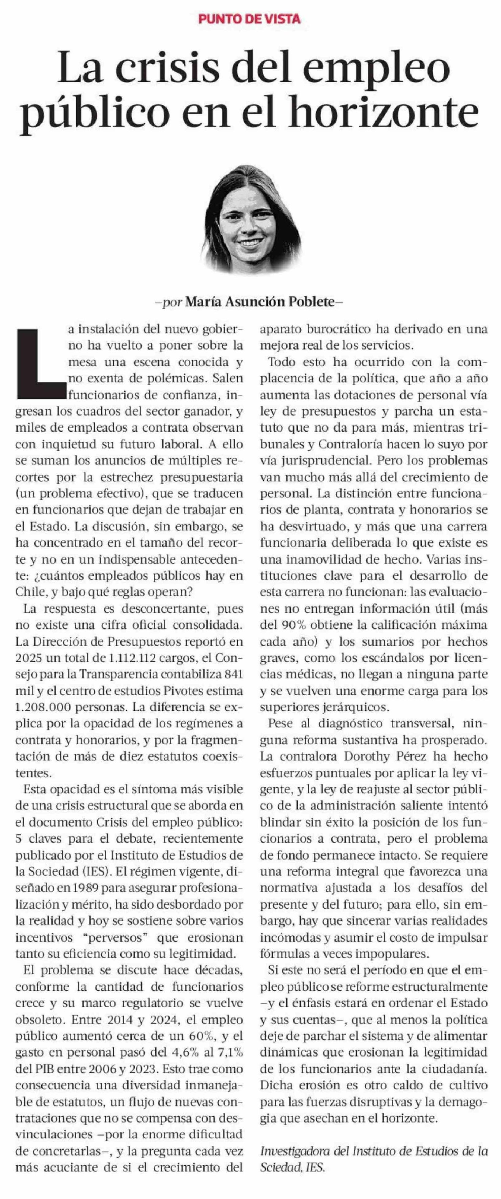 Columnas de Opinión: La crisis del empleo público en el horizonte 30-04-2026 La Tercera |