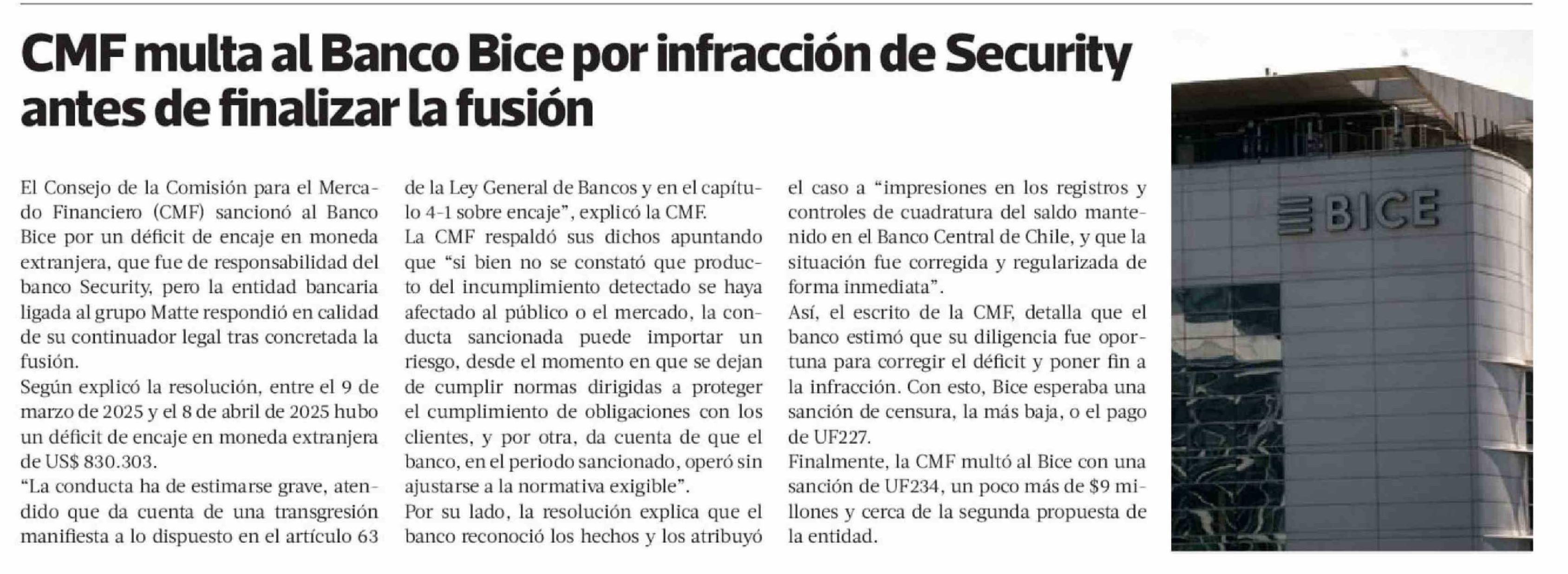 Título: CMF multa al Banco Bice por infracción de Security antes de finalizar la fusión