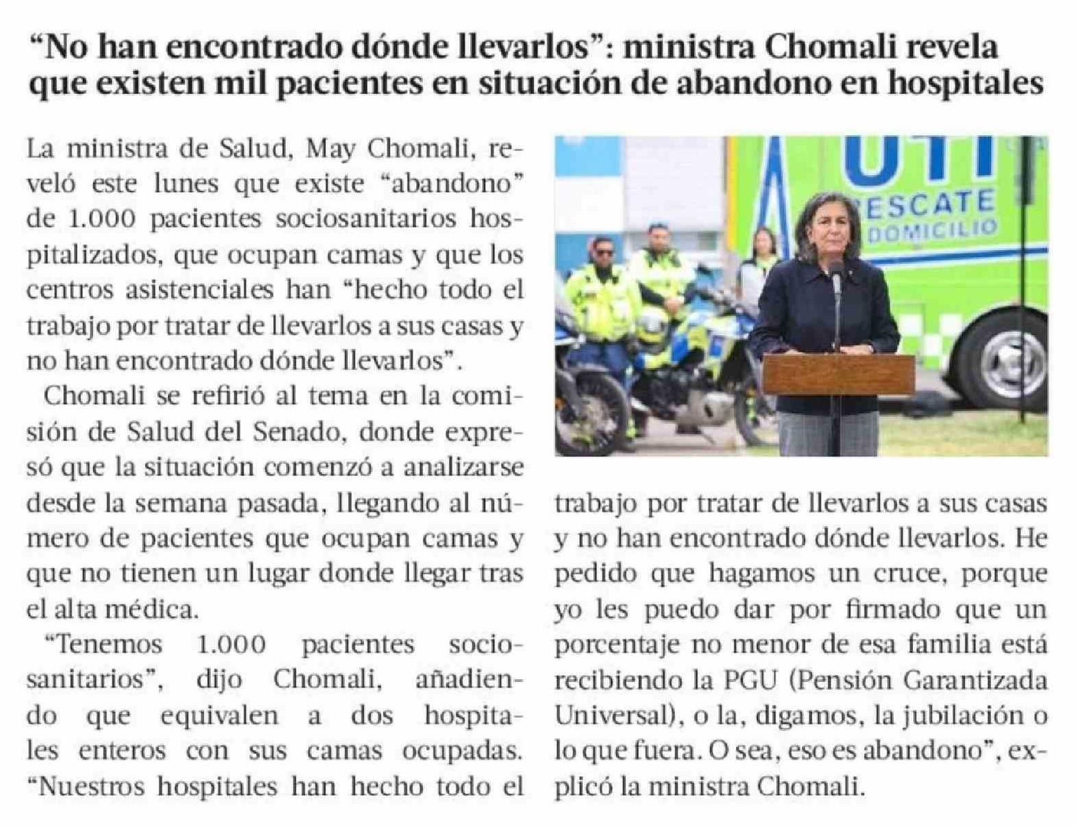 Título: "No han encontrado dónde llevarlos": ministra Chomali revela que existen mil pacientes en situación de abandono en hospitales
