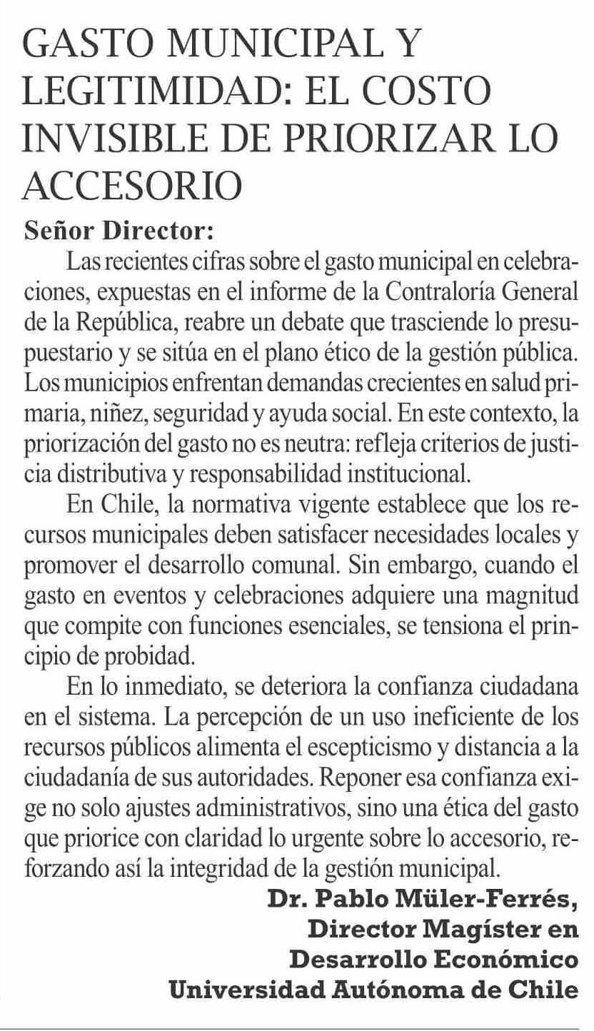 Cartas: Gasto munIcIPal y legItImIdad: el costo InvIsIble de PrIorIzar lo accesorIo
