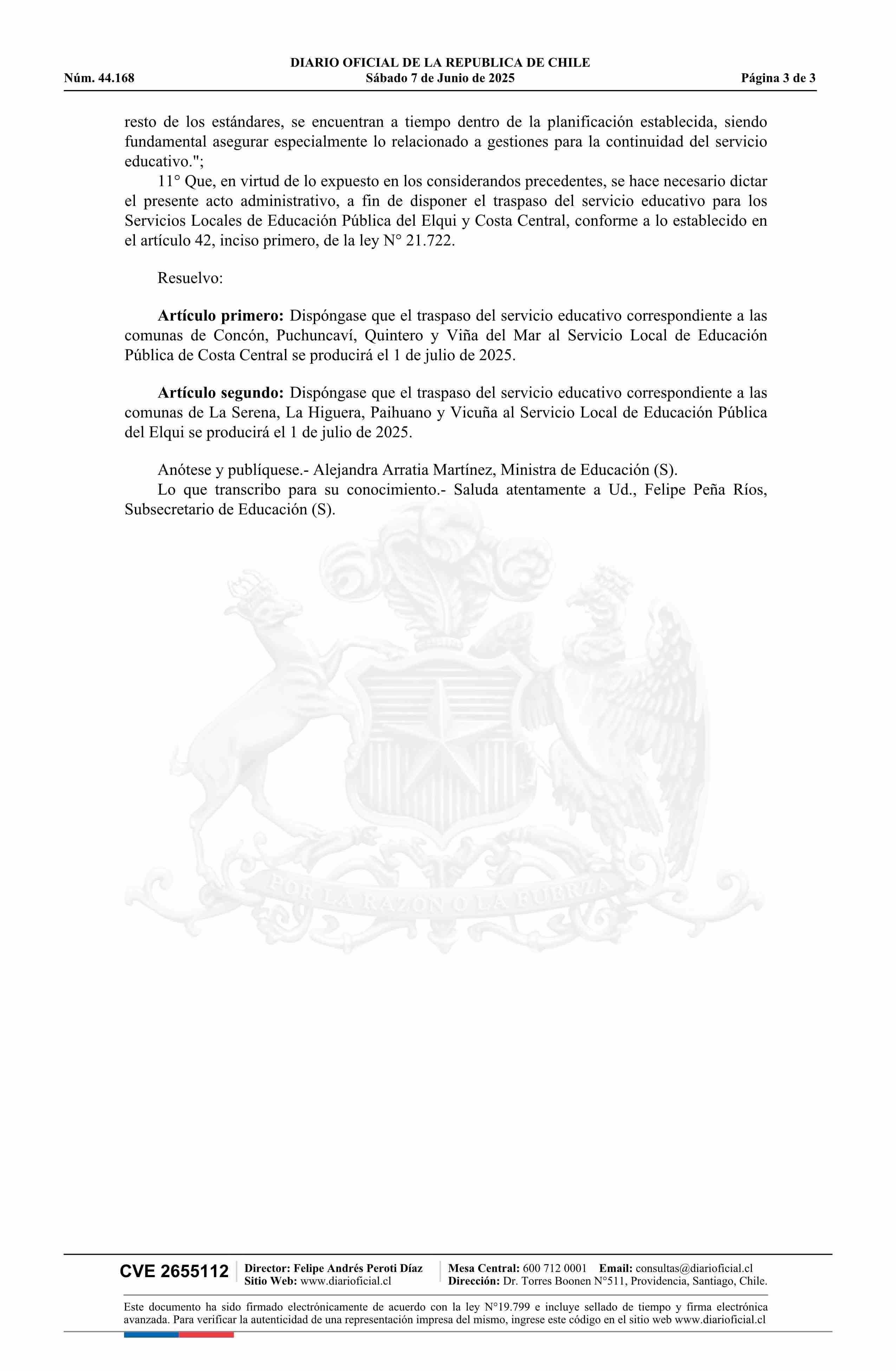 Resolución exenta número 7.343, de 2025.- Dispone el traspaso del servicio educacional correspondiente a los sostenedores que se indican a los Servicios Locales de Educación Pública del Elqui y Costa Central 07-06-2025 DIARIO OFICIAL CHILE - BOLETÍN OFICIAL DE MINERÍA |