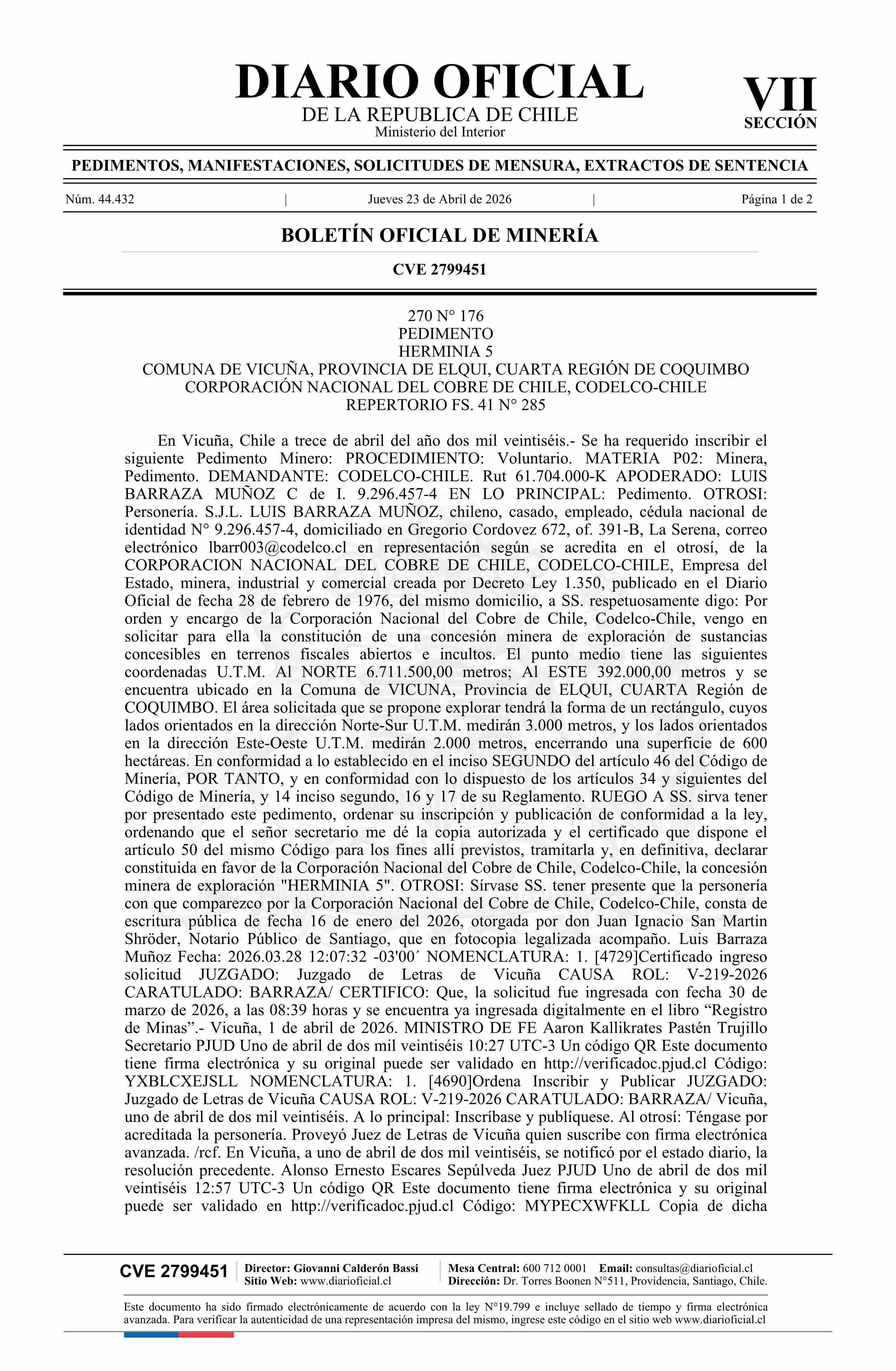 HERMINIA 5 / Corporación Nacional del Cobre de Chile 23-04-2026 DIARIO OFICIAL CHILE - BOLETÍN OFICIAL DE MINERÍA |