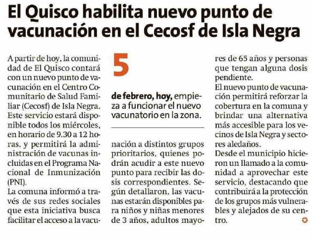 El Quisco habilita nuevo punto de vacunación en el Cecosf de Isla Negra 05-02-2025 El Líder |