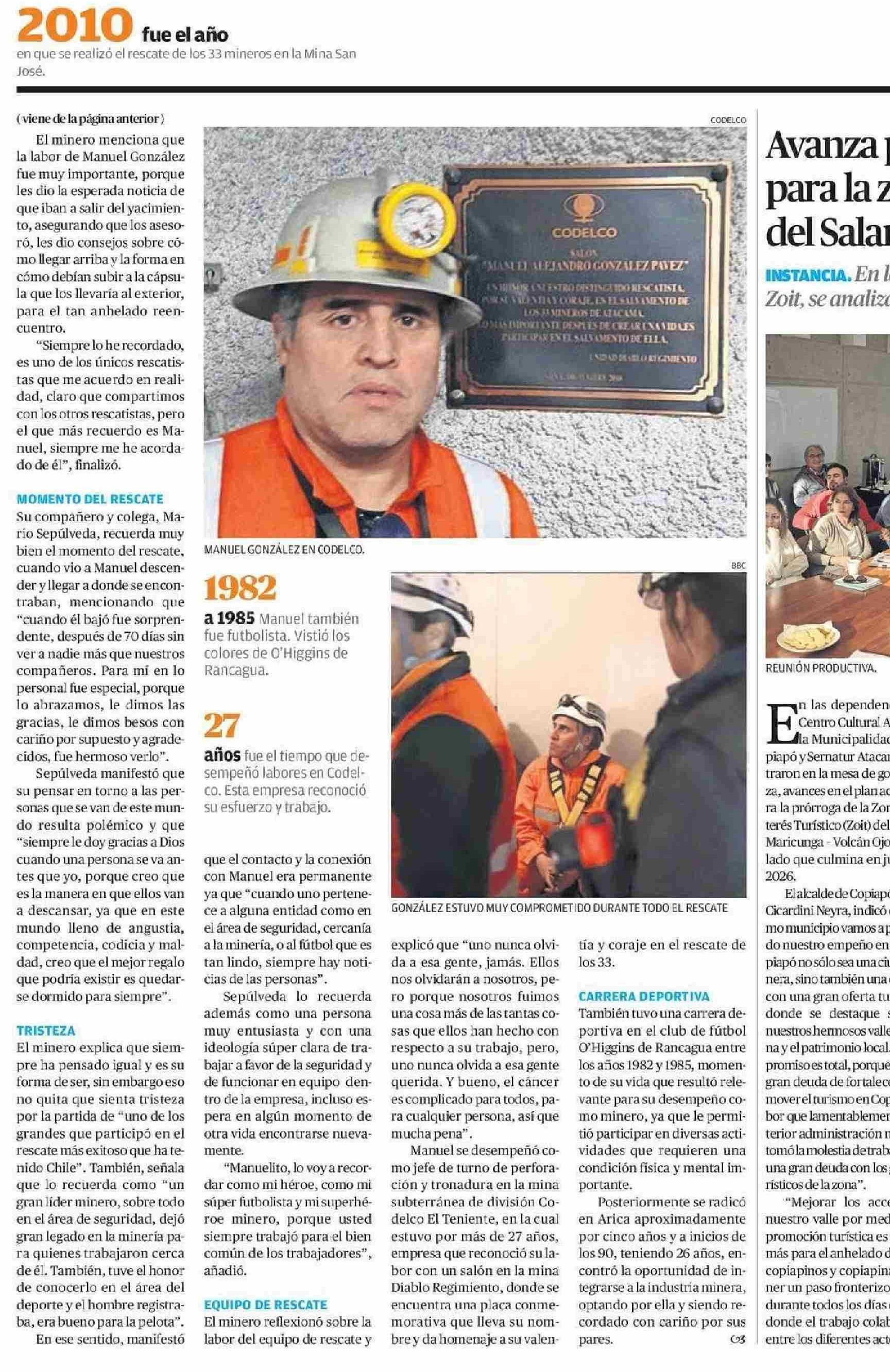 Fallece Manuel González: el primer rigadista que ayudó en el rescate de los 33 en la Mina San José 02-06-2025 El Diario de Atacama |
