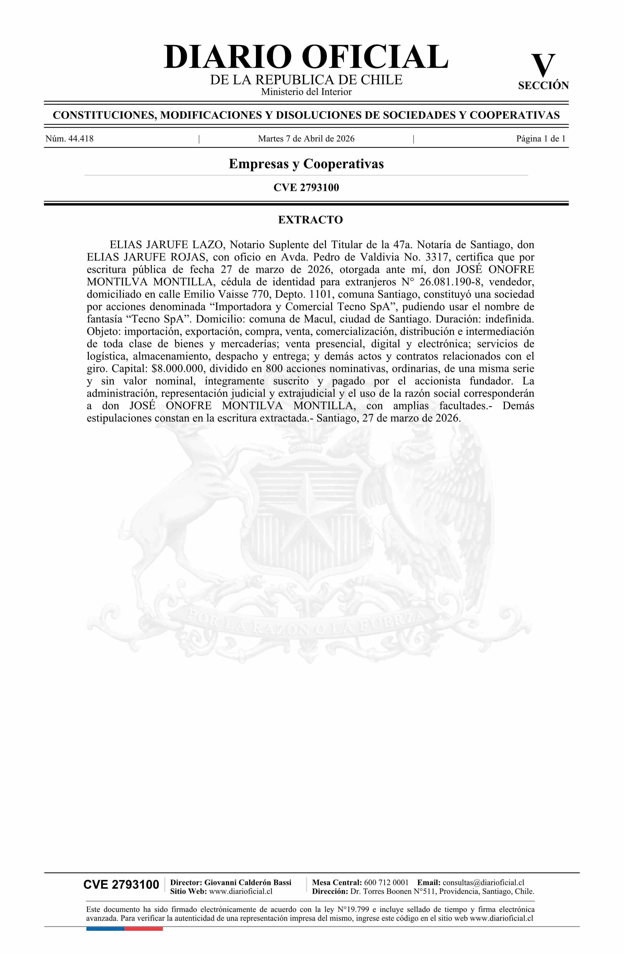IMPORTADORA Y COMERCIAL TECNO SpA 07-04-2026 Diario Oficial Edición Electrónica |