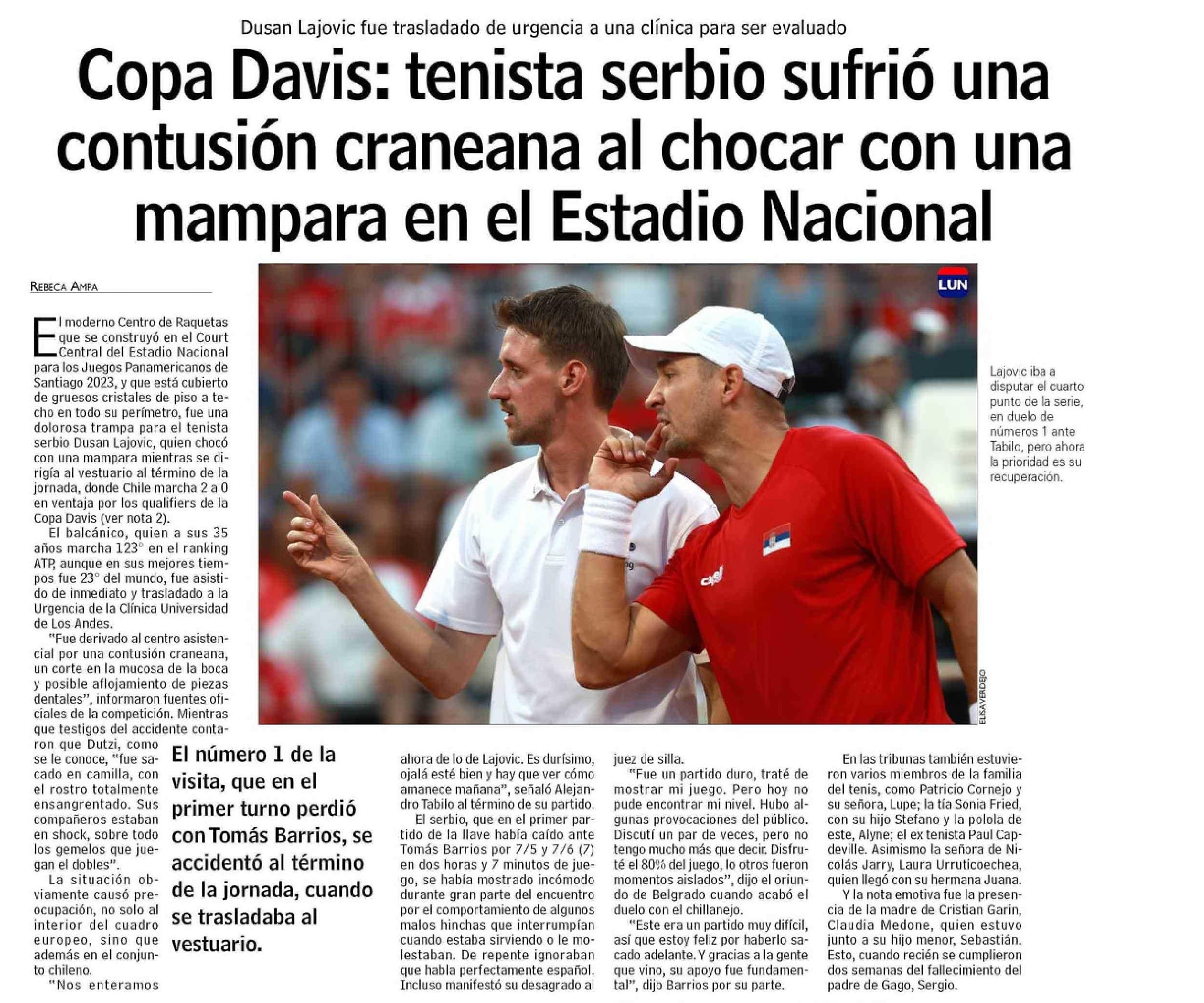 Título: Copa Davis: tenista serbio sufrió una contusión craneana al chocar con una mampara en el Estadio Nacional