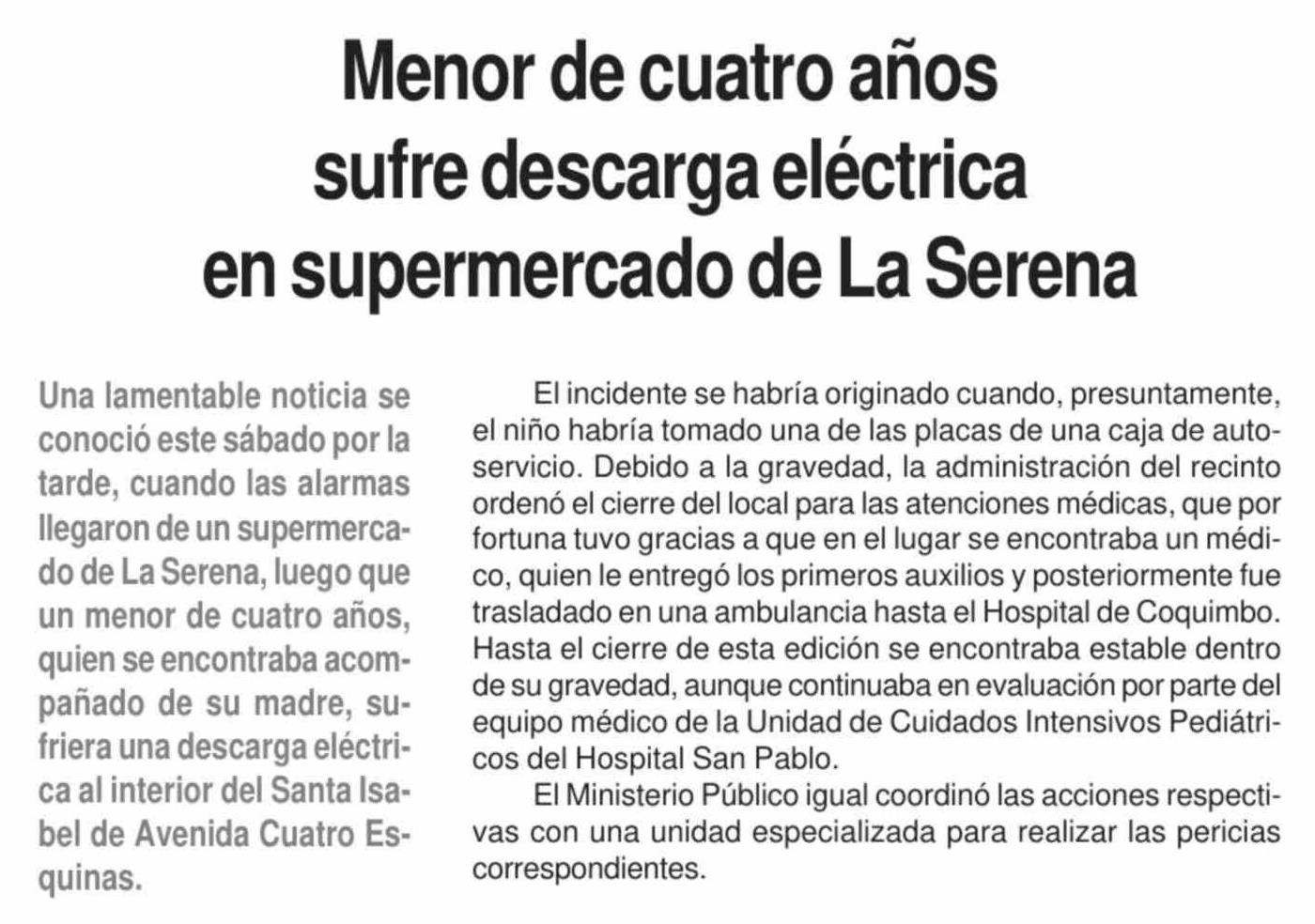 | Título: | Menor de cuatro años sufre descarga eléctrica en supermercado de La Serena |