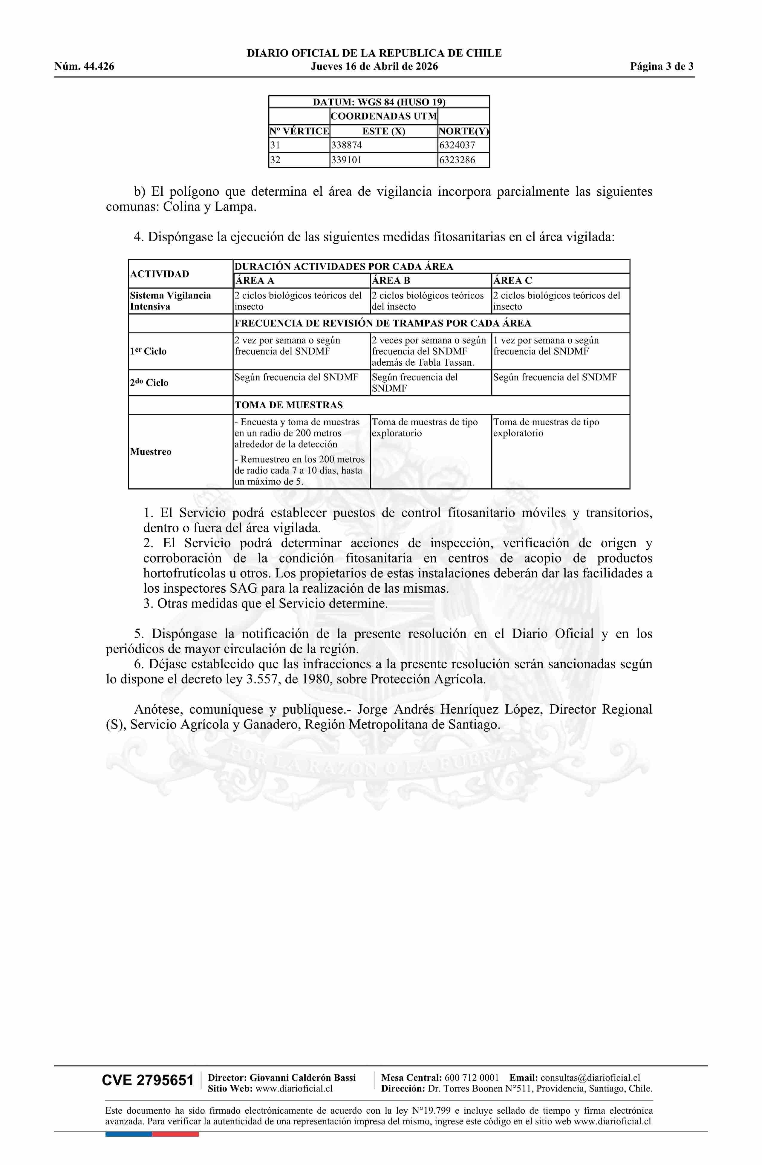 Resolución exenta número 683, de 2026.- Activa vigilancia intensiva ante la detección de un único ejemplar adulto de Mosca del Mediterráneo (Ceratitis capitata Wied), comuna de Lampa 16-04-2026 Diario Oficial Edición Electrónica |