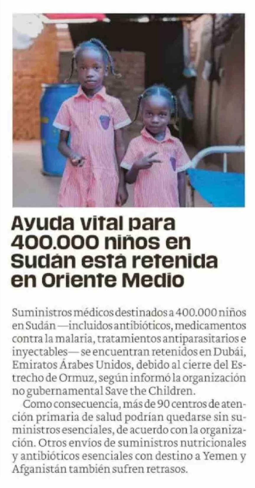 Título: Ayuda vital para 400.000 niños en Sudan está retenida en Oriente Medio