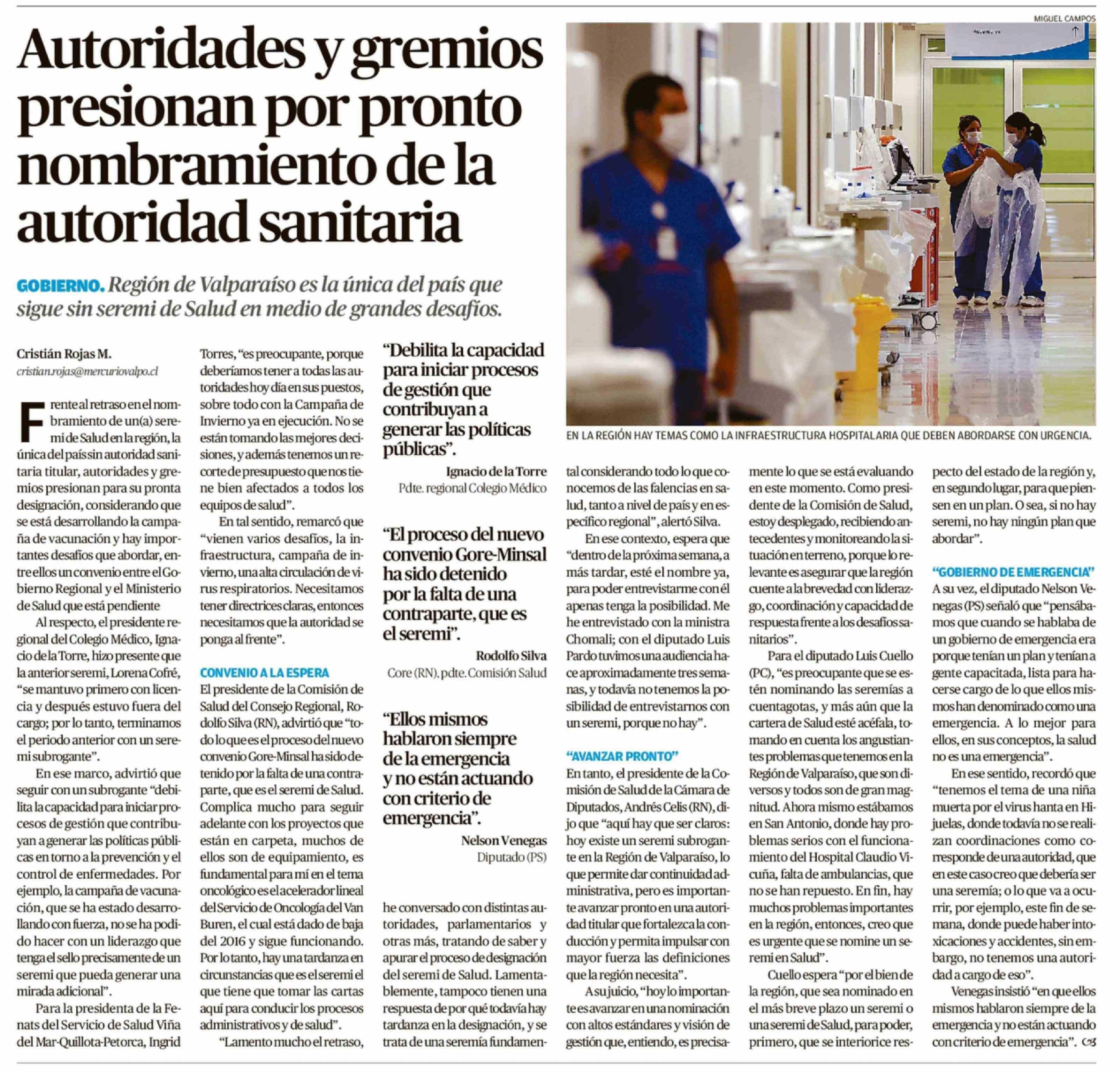 Autoridades y gremios presionan por pronto nombramiento de la autoridad sanitaria 02-04-2026 El Mercurio de Valparaíso |