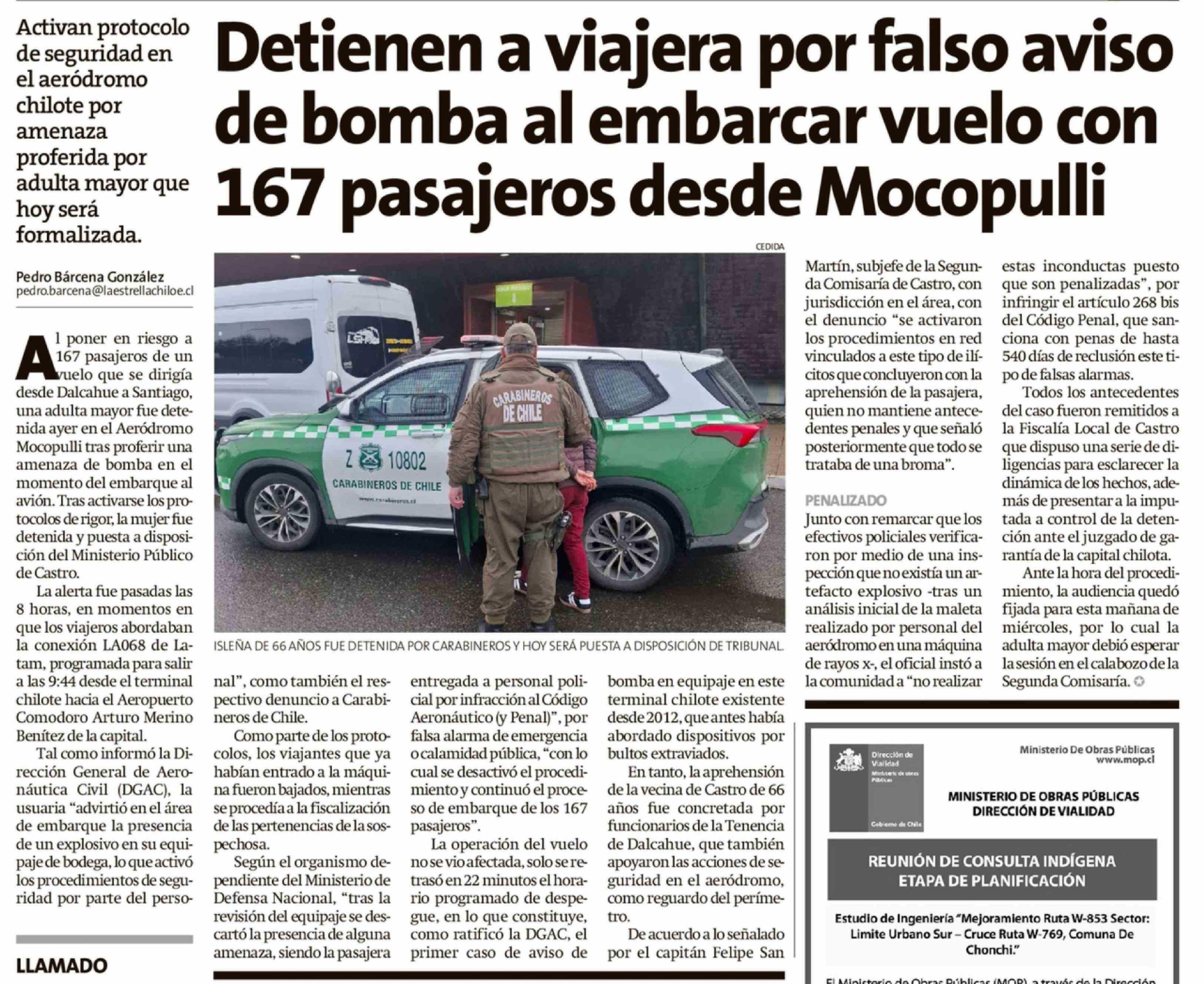 Detienen a viajera por falso aviso de bomba al embarcar vuelo con 167 pasajeros desde Mocopulli 15-04-2026 La Estrella de Chiloé |