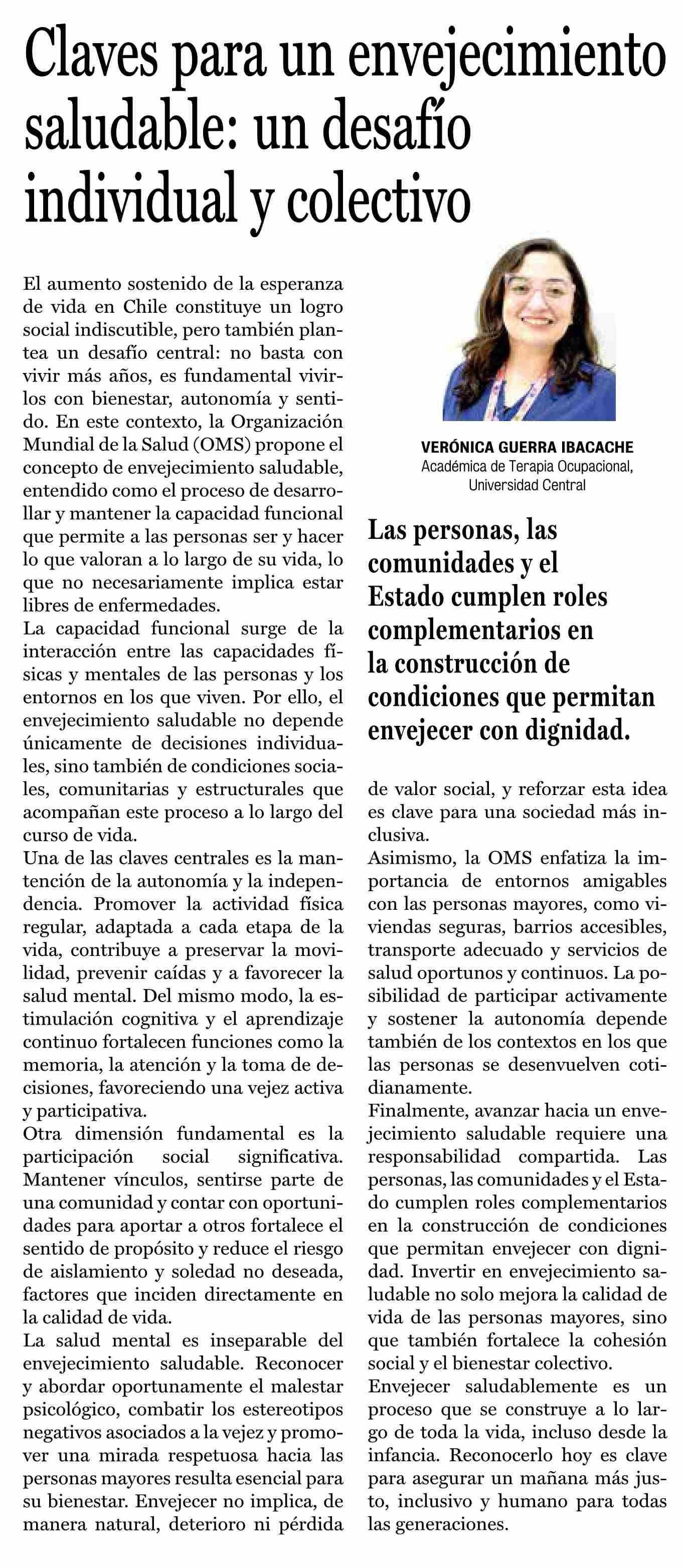 Columnas de Opinión: Claves para un envejecimiento saludable: un desafío individual y colectivo 26-01-2026 La Prensa de Curicó |