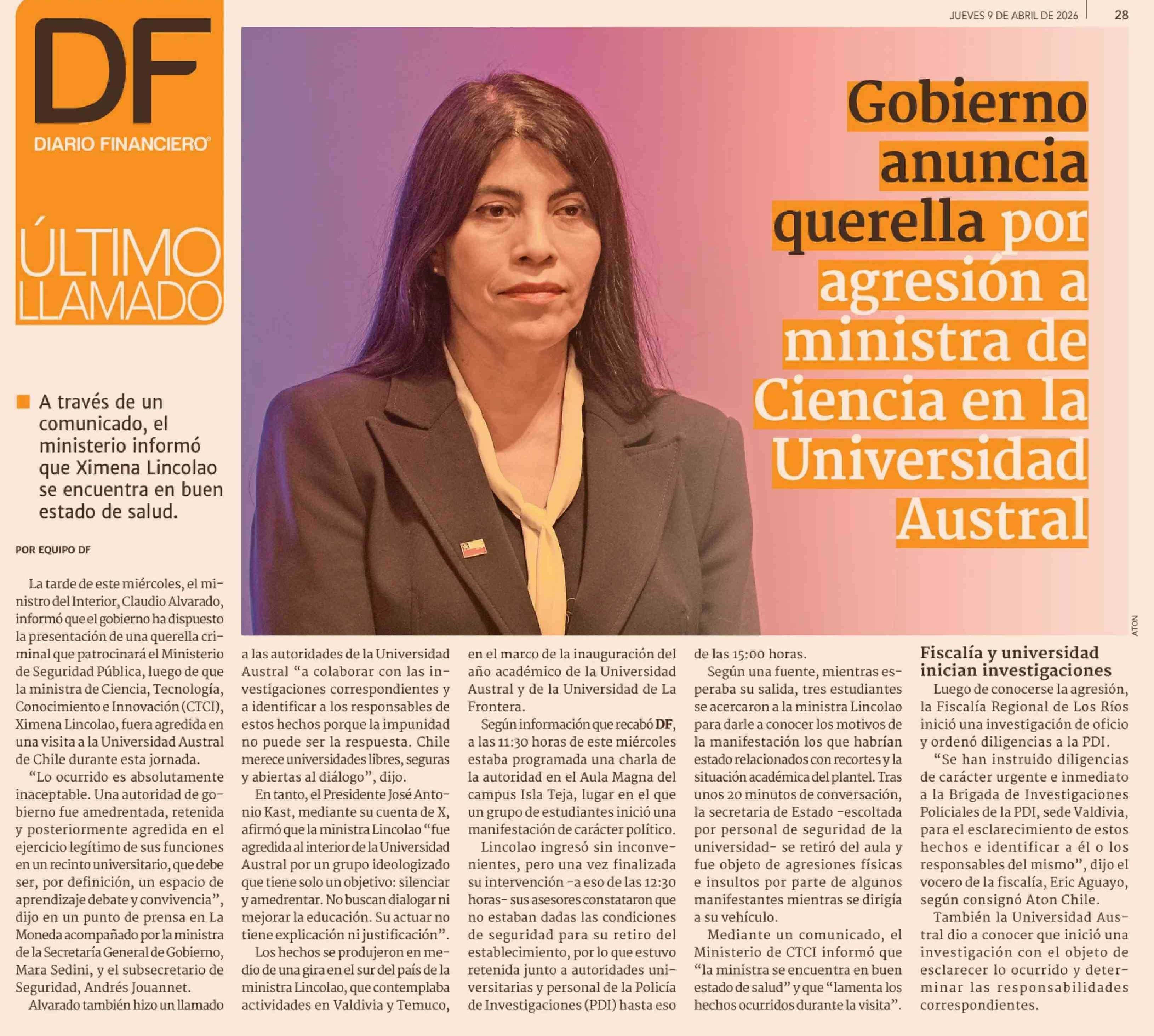 Título: Gobierno anuncia querella por agresion a ministra de Ciencia en la Universidad Austral