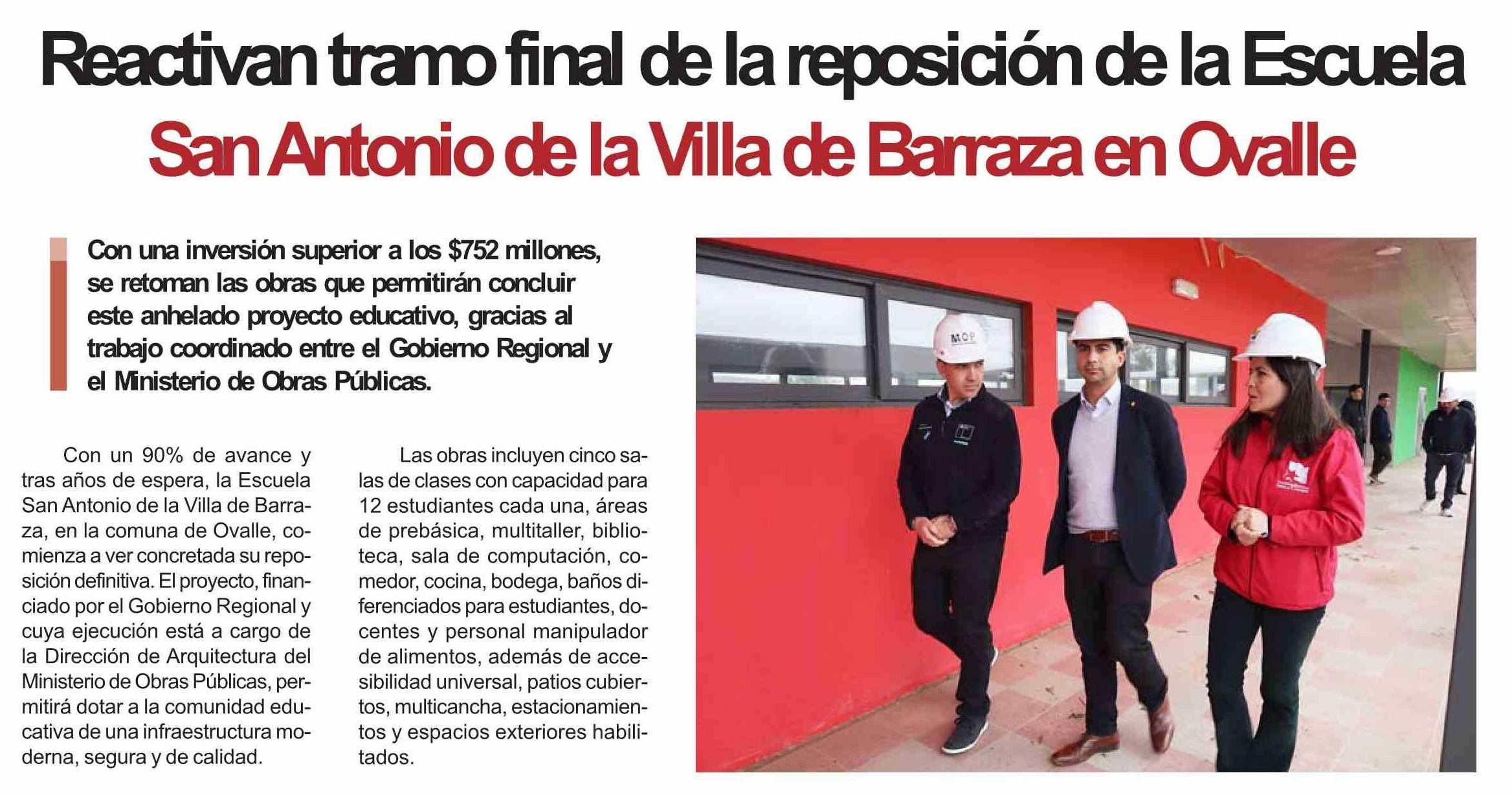 | Título: | Reactivan tramo final de la reposición de la Escuela San Antonio de la Villa de Barraza en Ovalle |