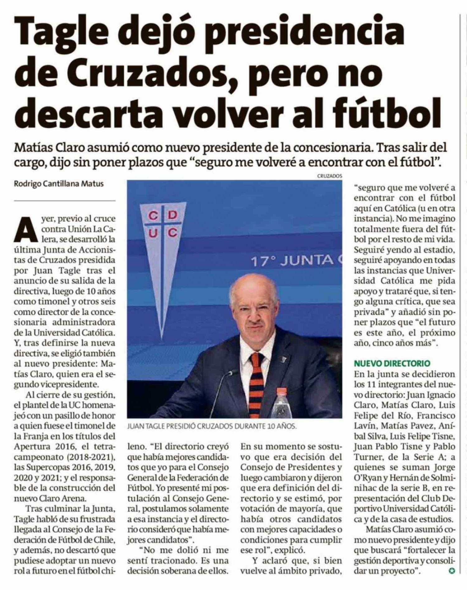 | Título: | Tagle dejó presidencia de Cruzados, pero no descarta volver al fútbol |