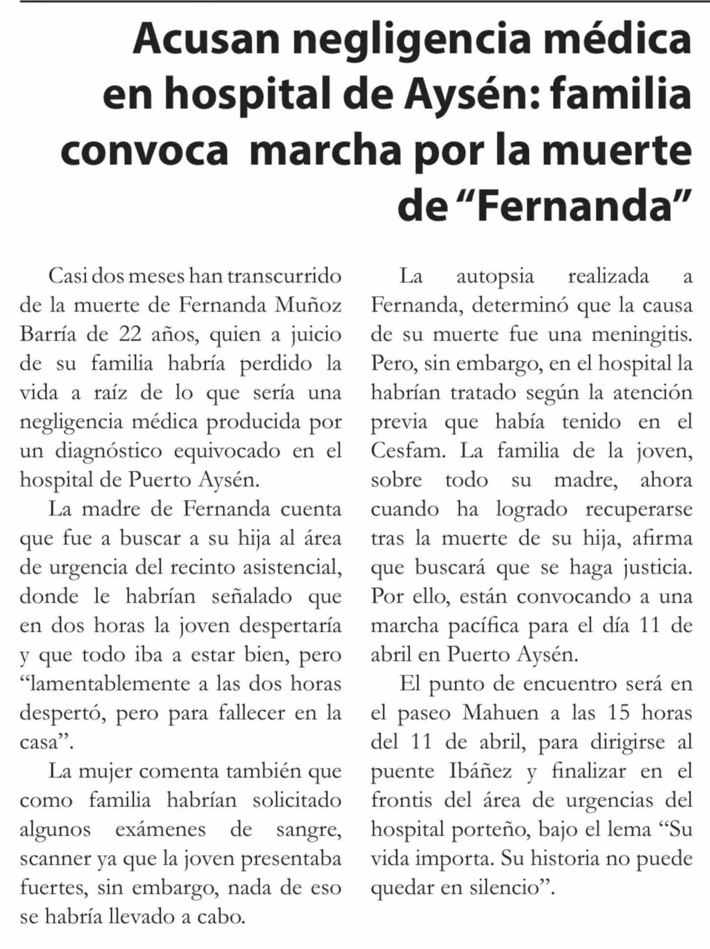 Título: Acusan negligencia médica en hospital de Aysén: familia convoca marcha por la muerte de "Fernanda"