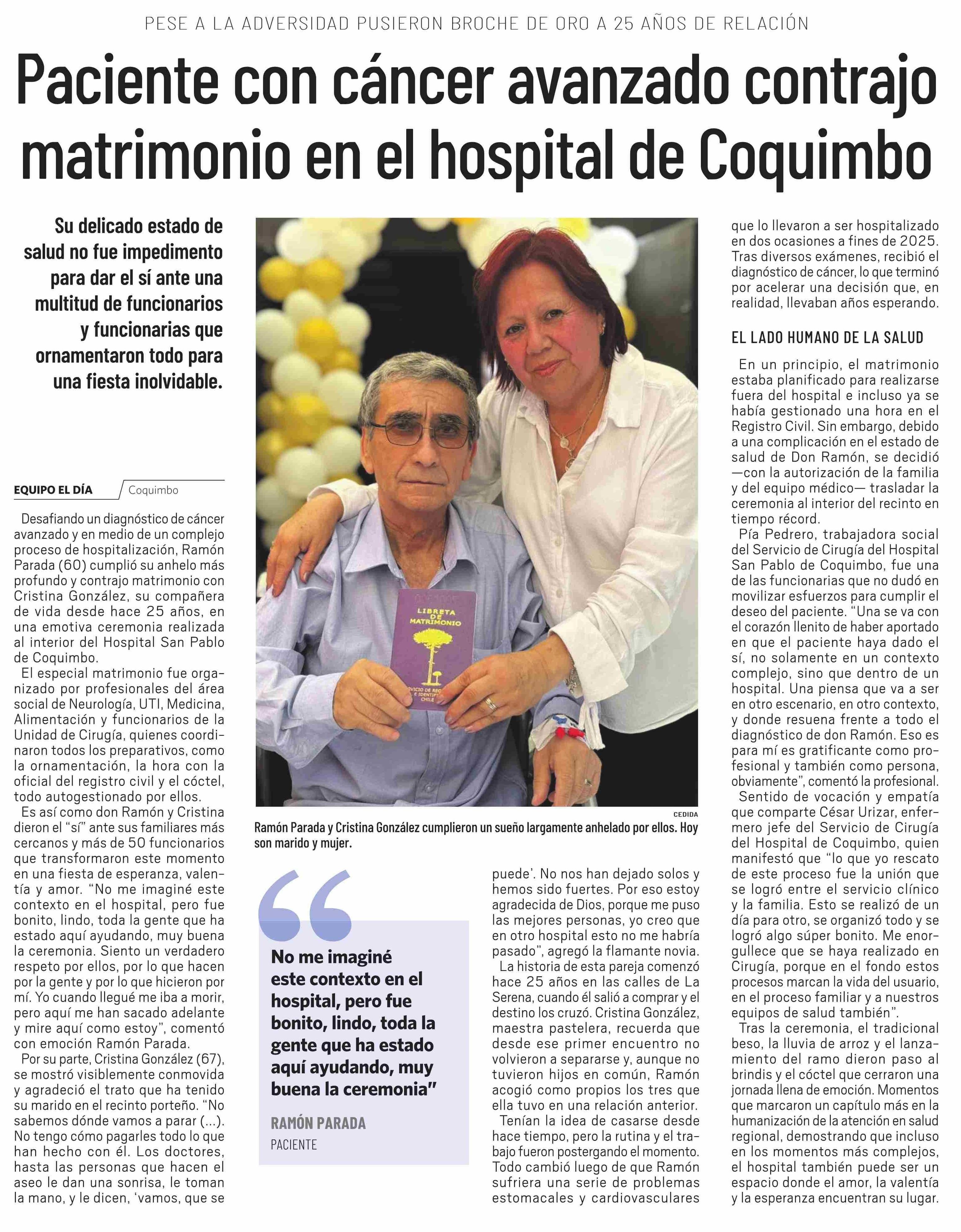 Paciente con cáncer avanzado contrajo matrimonio en el hospital de Coquimbo 14-01-2026 El Día |