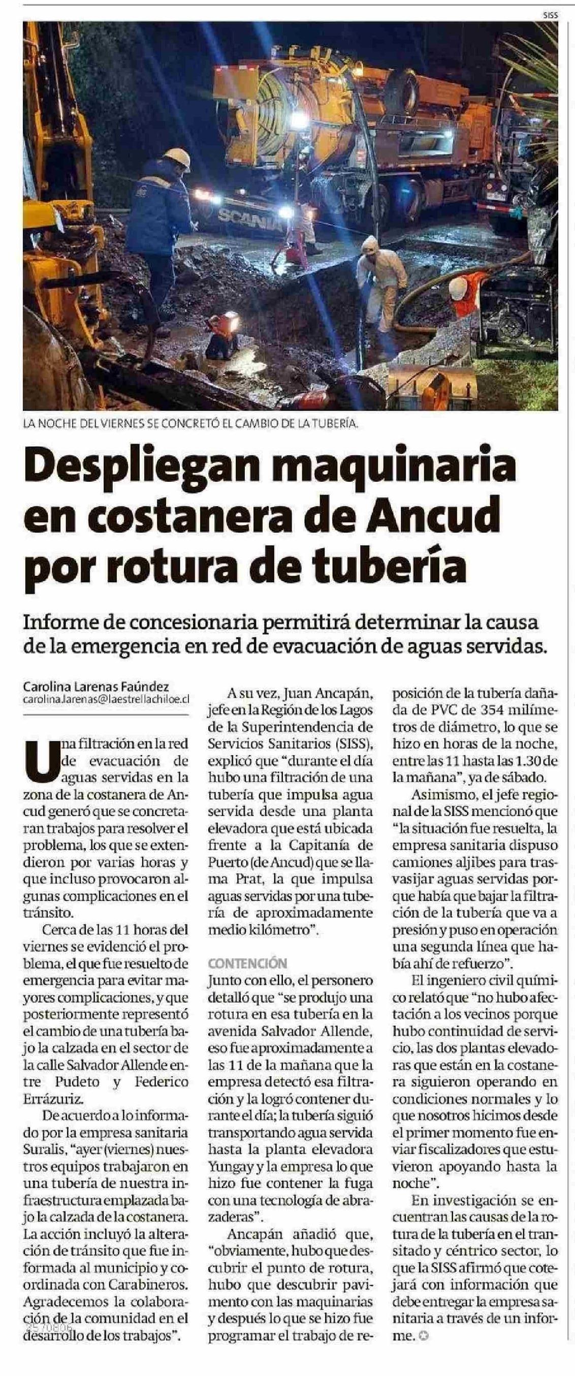 Despliegan maquinaria por rotura de tubería en costanera de Ancud 15-06-2025 La Estrella de Chiloé |