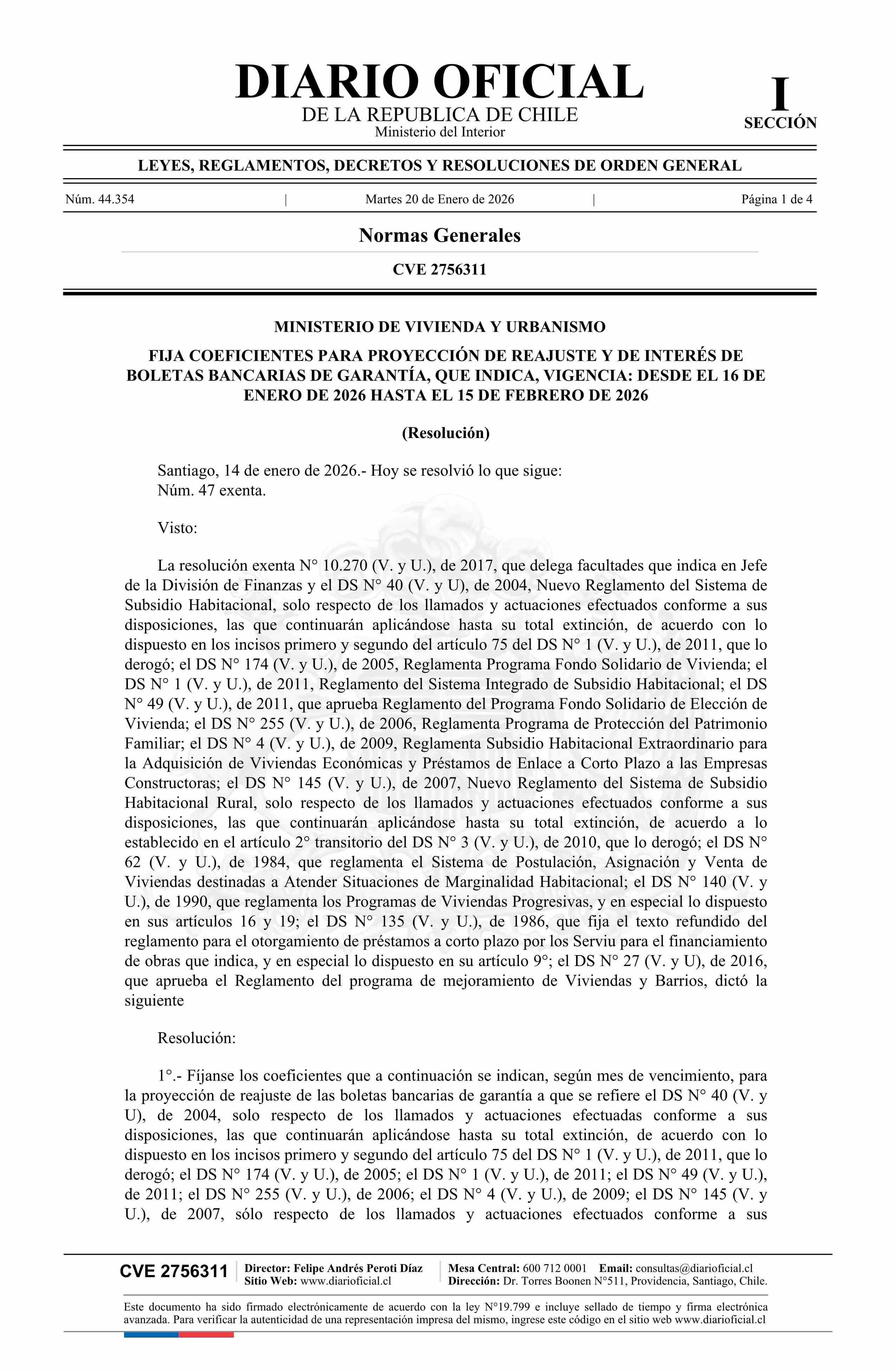 Título: Resolución exenta número 47, de 2026.- Fija coeficientes para proyección de reajuste y de interés de boletas bancarias de garantía, que indica, vigencia: desde el 16 de enero de 2026 hasta el 15 de febrero de 2026