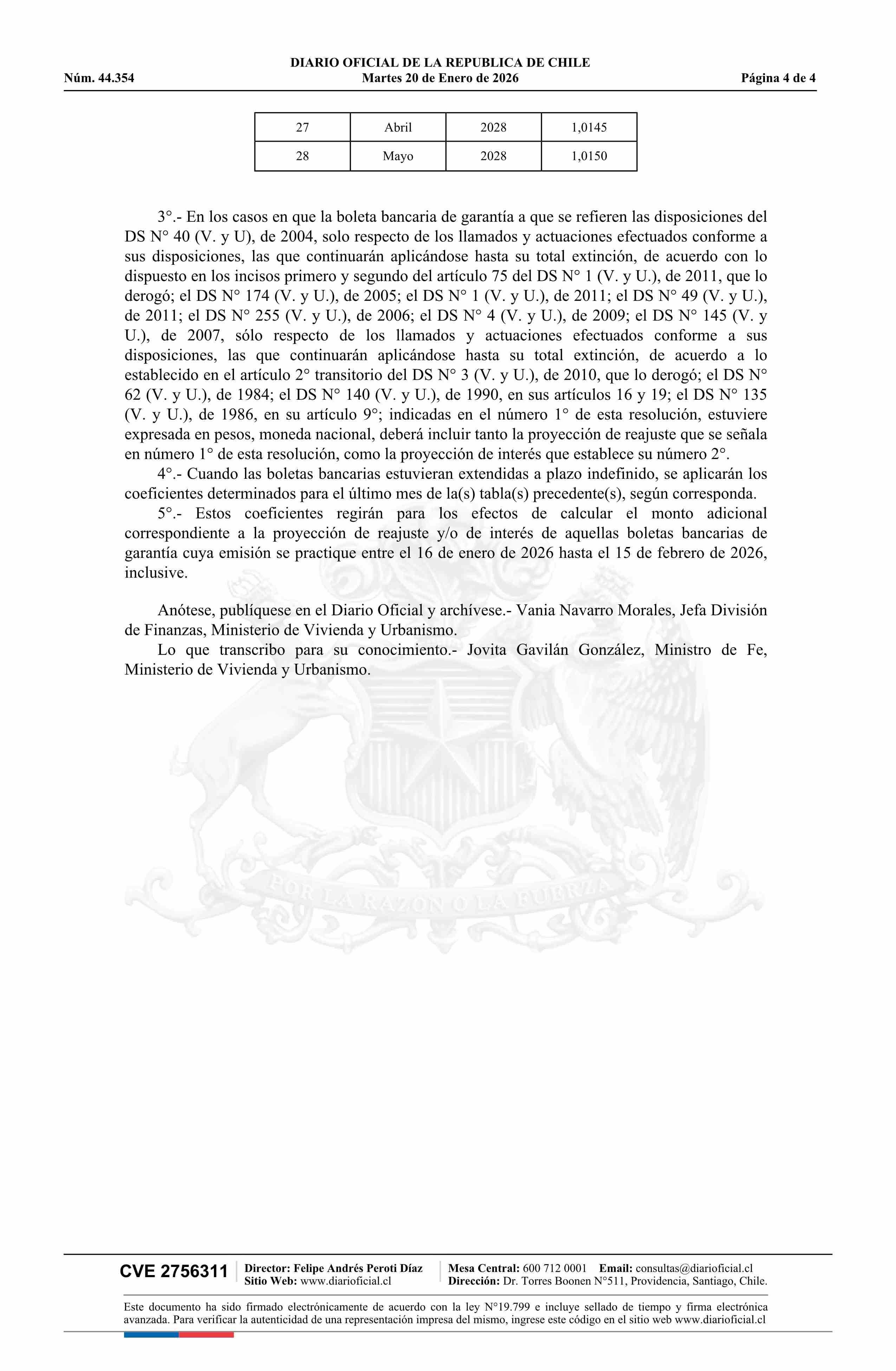 Resolución exenta número 47, de 2026.- Fija coeficientes para proyección de reajuste y de interés de boletas bancarias de garantía, que indica, vigencia: desde el 16 de enero de 2026 hasta el 15 de febrero de 2026