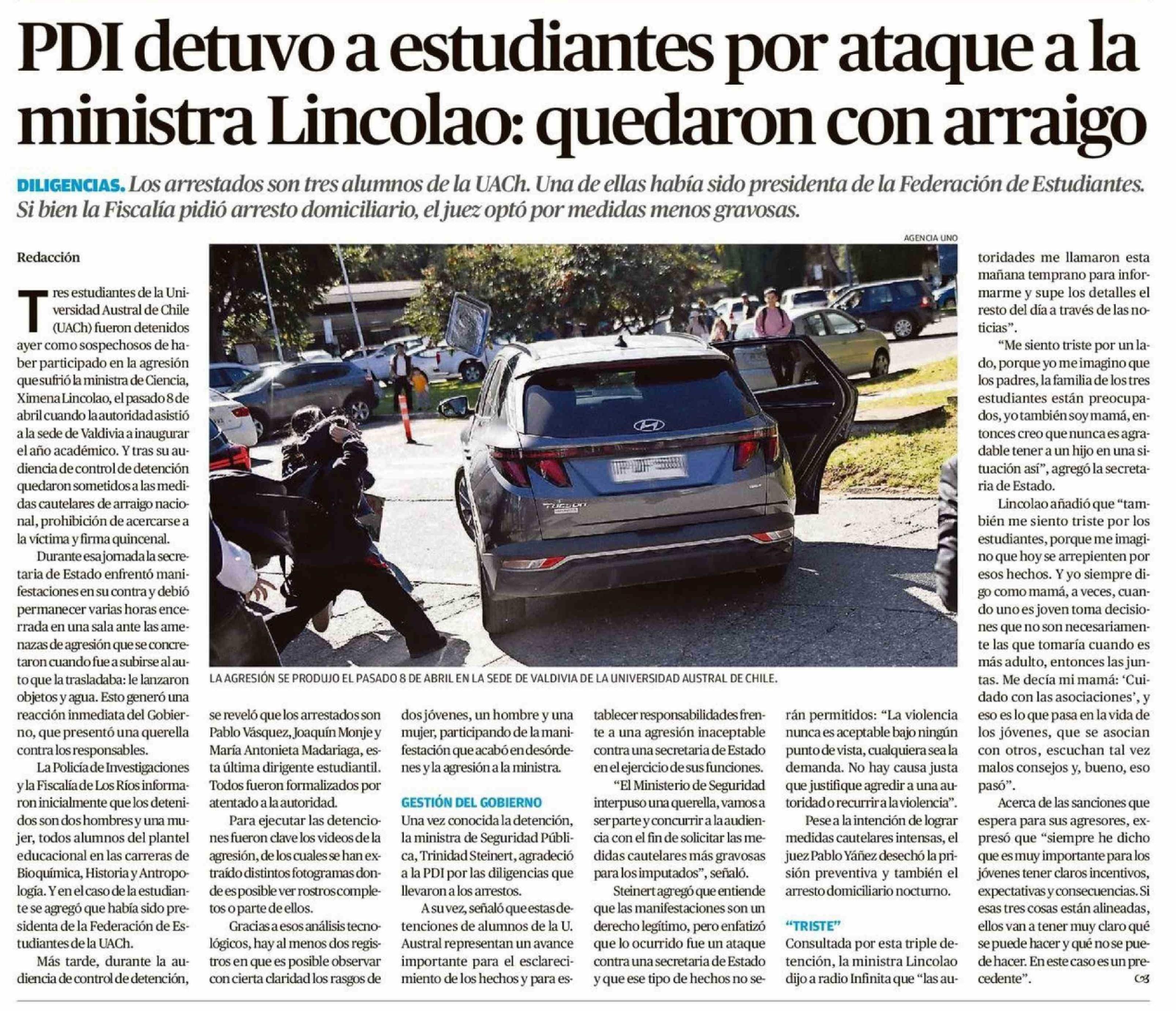 PDI detuvo a estudiantes por ataque a la ministra Lincolao: quedaron con arraigo 21-04-2026 El Mercurio de Valparaíso |