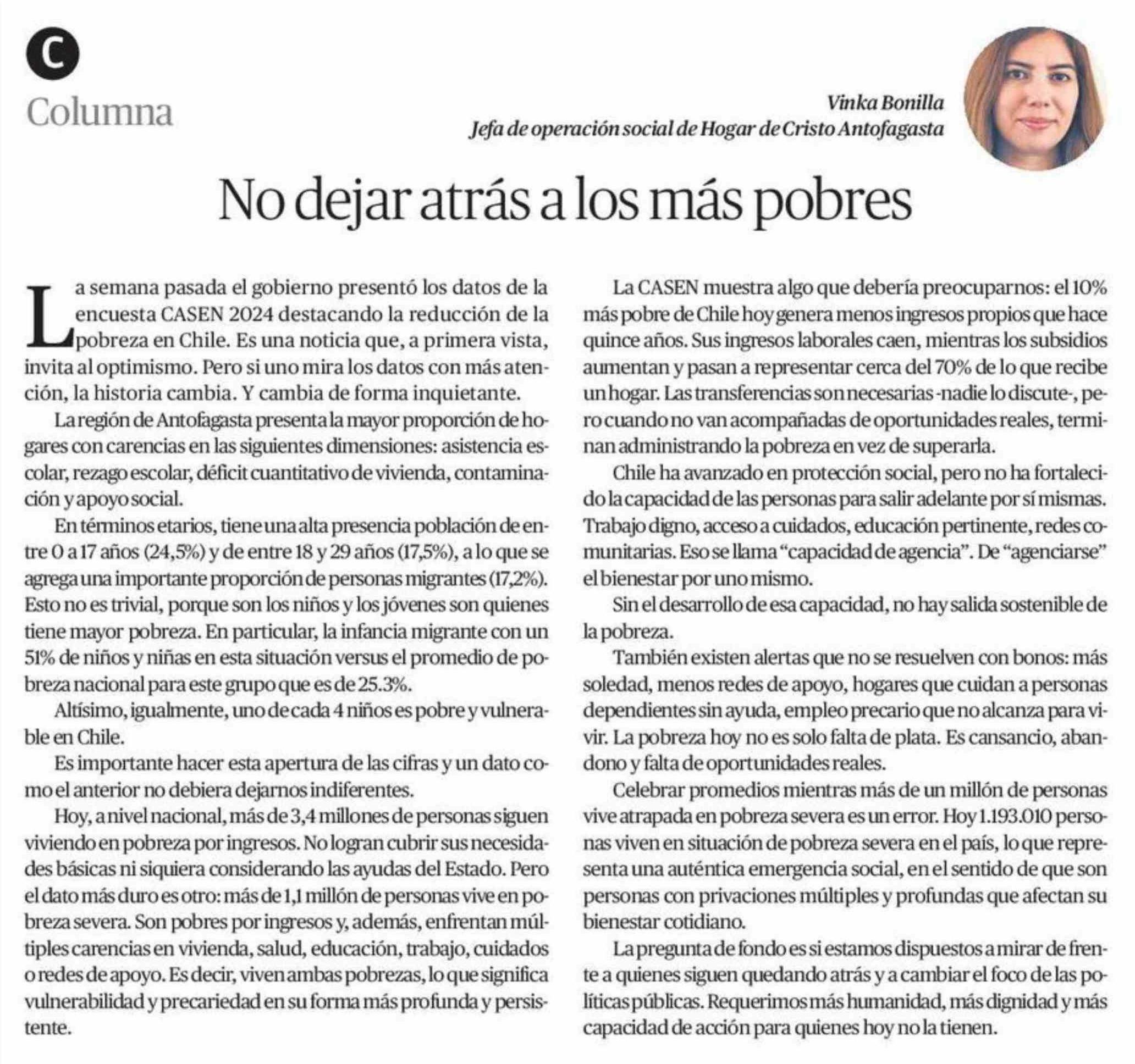 Columnas de Opinión: No dejar atrás a los más pobres 27-01-2026 El Mercurio de Antofagasta |