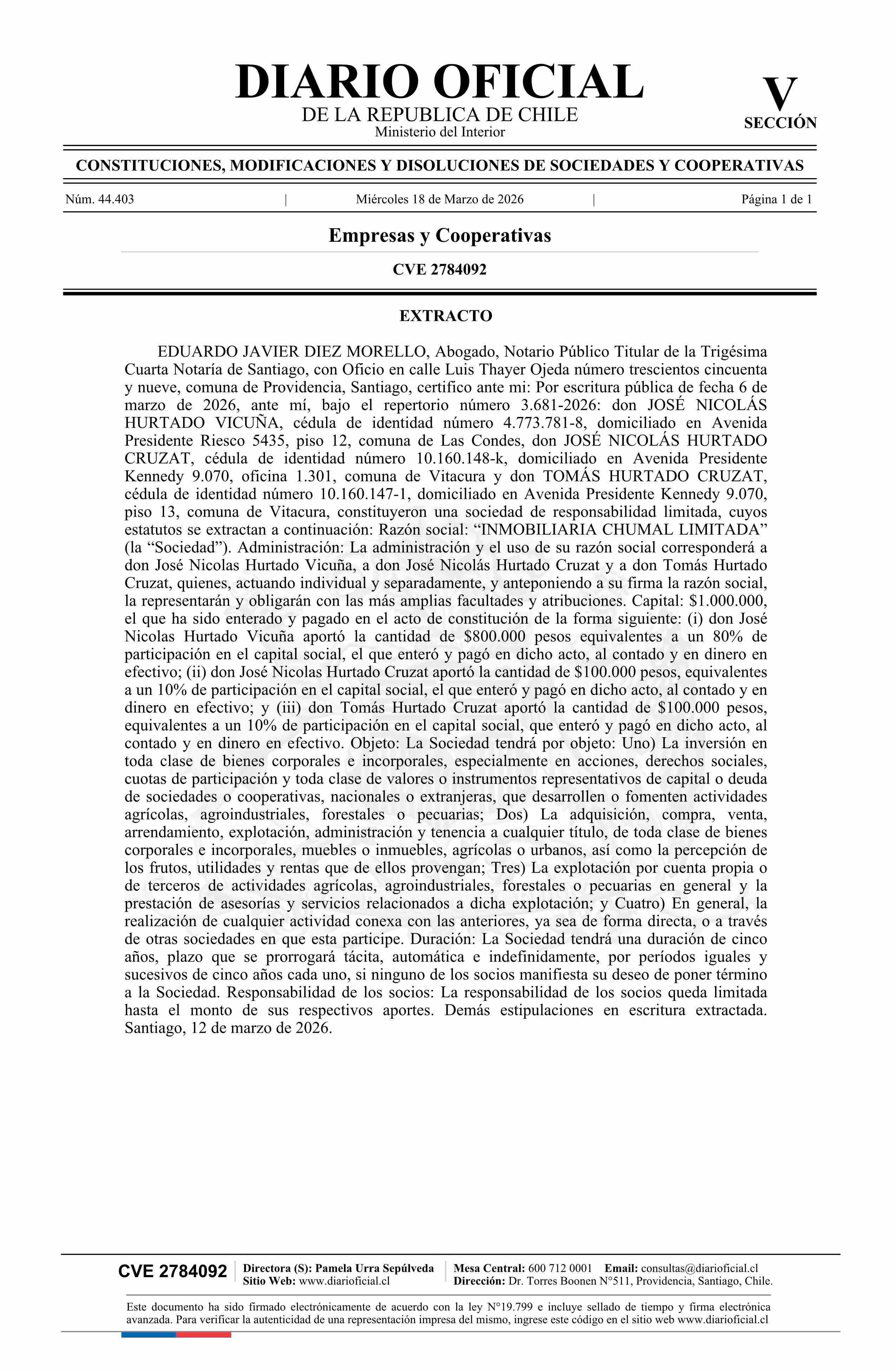 Inmobiliaria Chumal Limitada 18-03-2026 Diario Oficial Edición Electrónica |