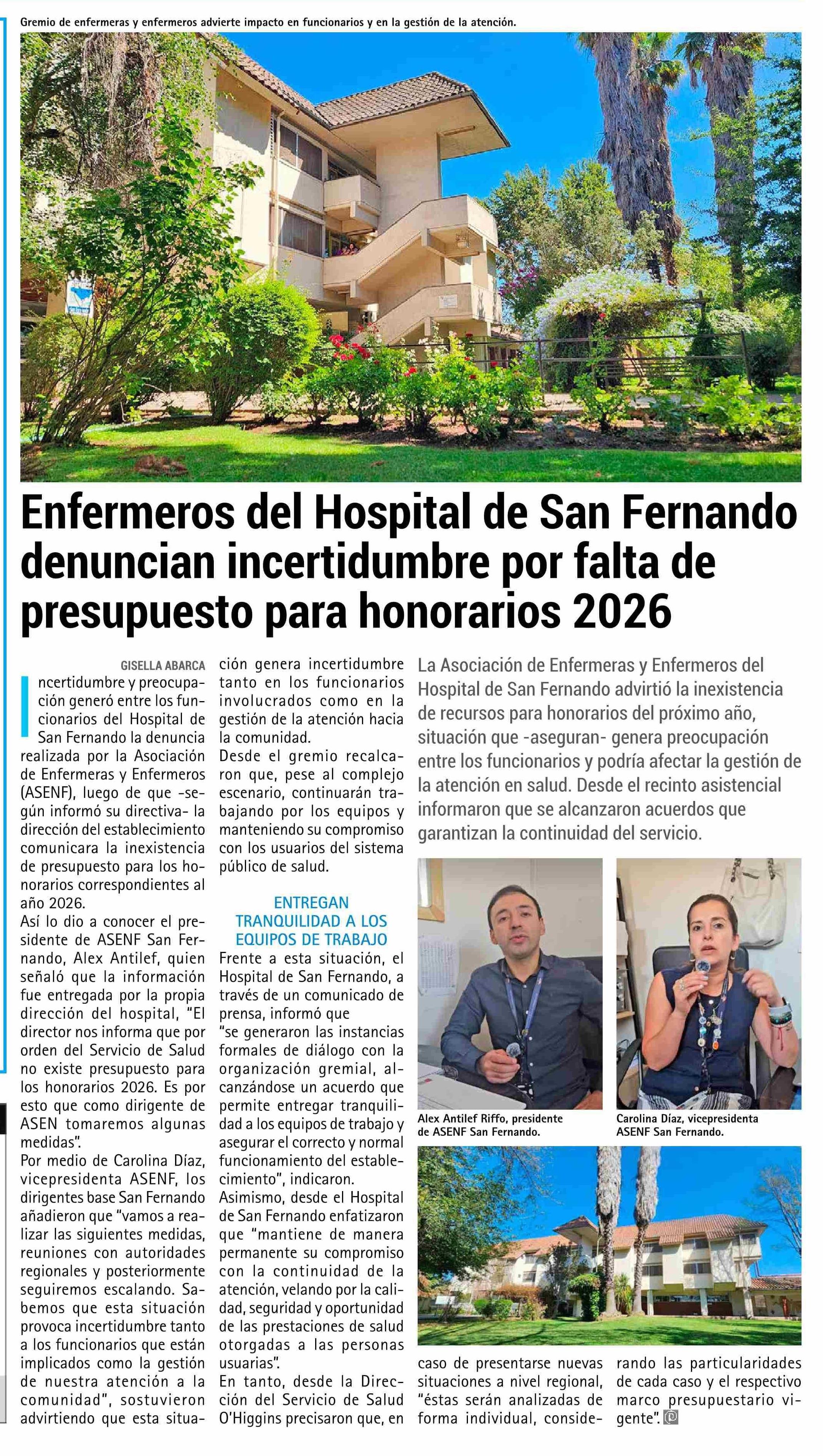 Enfermeros del Hospital de San Fernando denuncian incertidumbre por falta de presupuesto para honorarios 2026 28-01-2026 El Rancagüino |