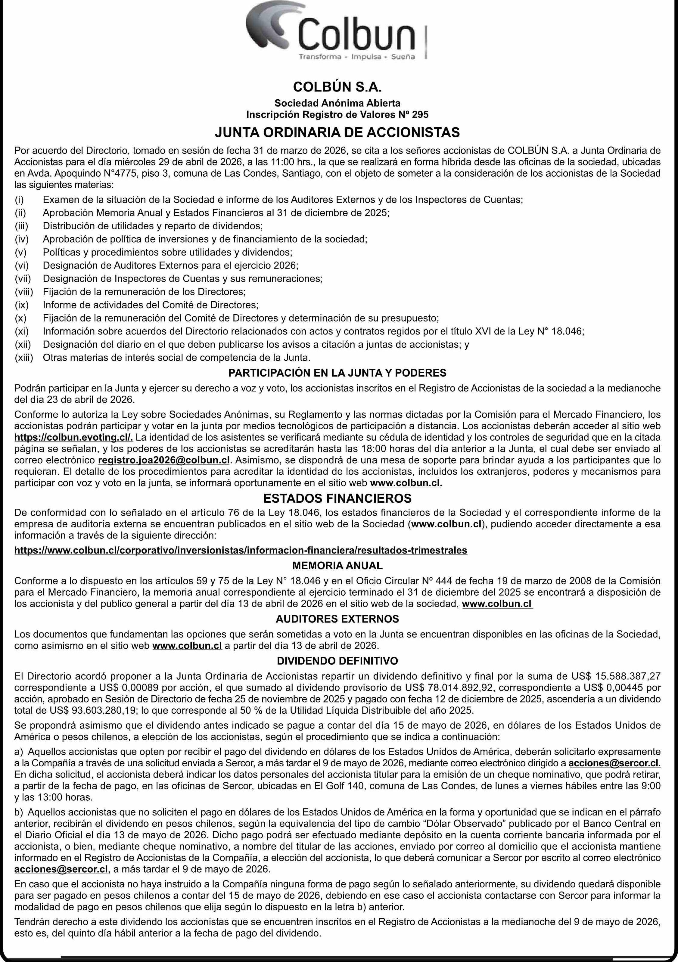 Extractos: COLBÚN S.A. 21-04-2026 El Mercurio |