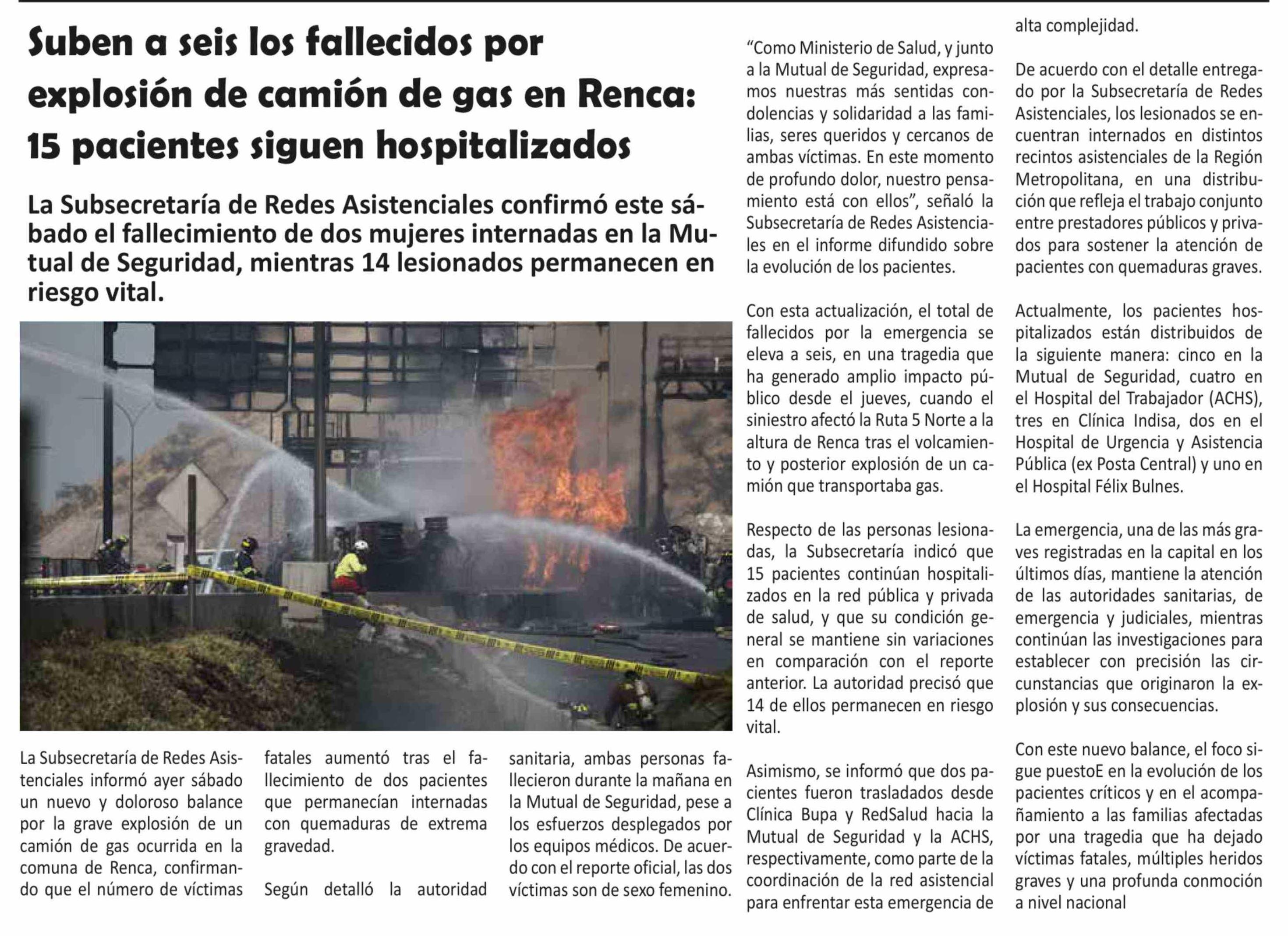 Título: Suben a seis los fallecidos por explosión de camión de gas en Renca: 15 pacientes siguen hospitalizados