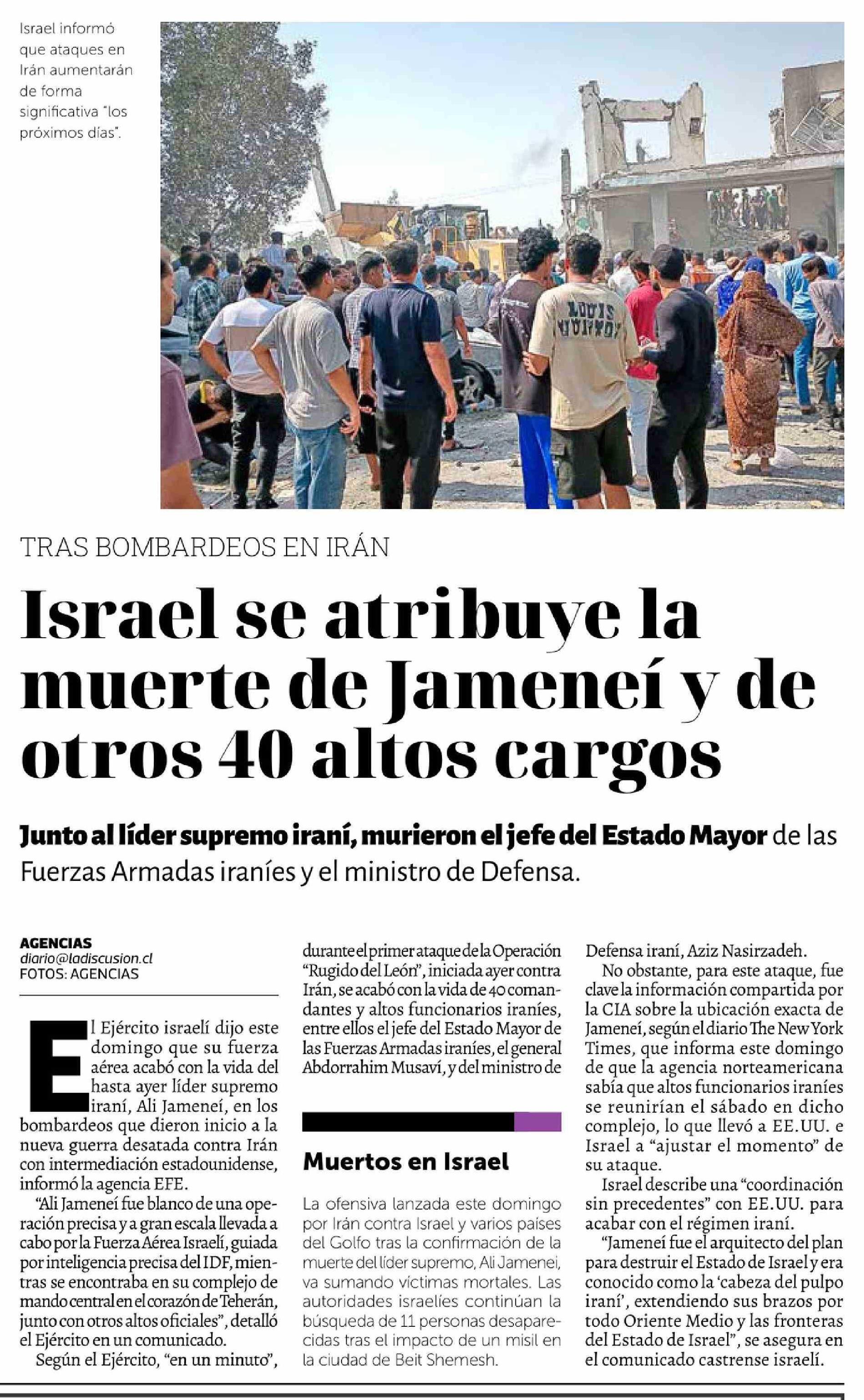Título: Israel se atribuye la muerte de Jameneí y de otros 40 altos cargos