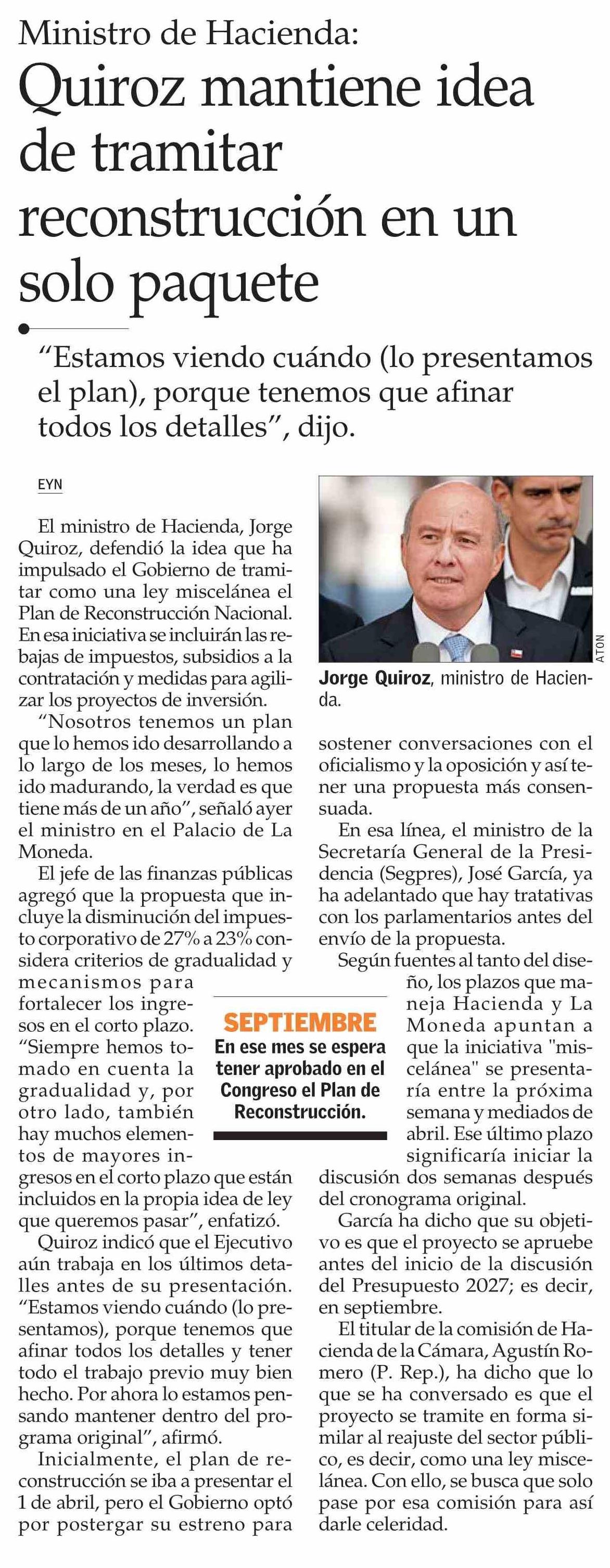 Título: Quiroz mantiene idea de tramitar reconstrucción en un solo paquete