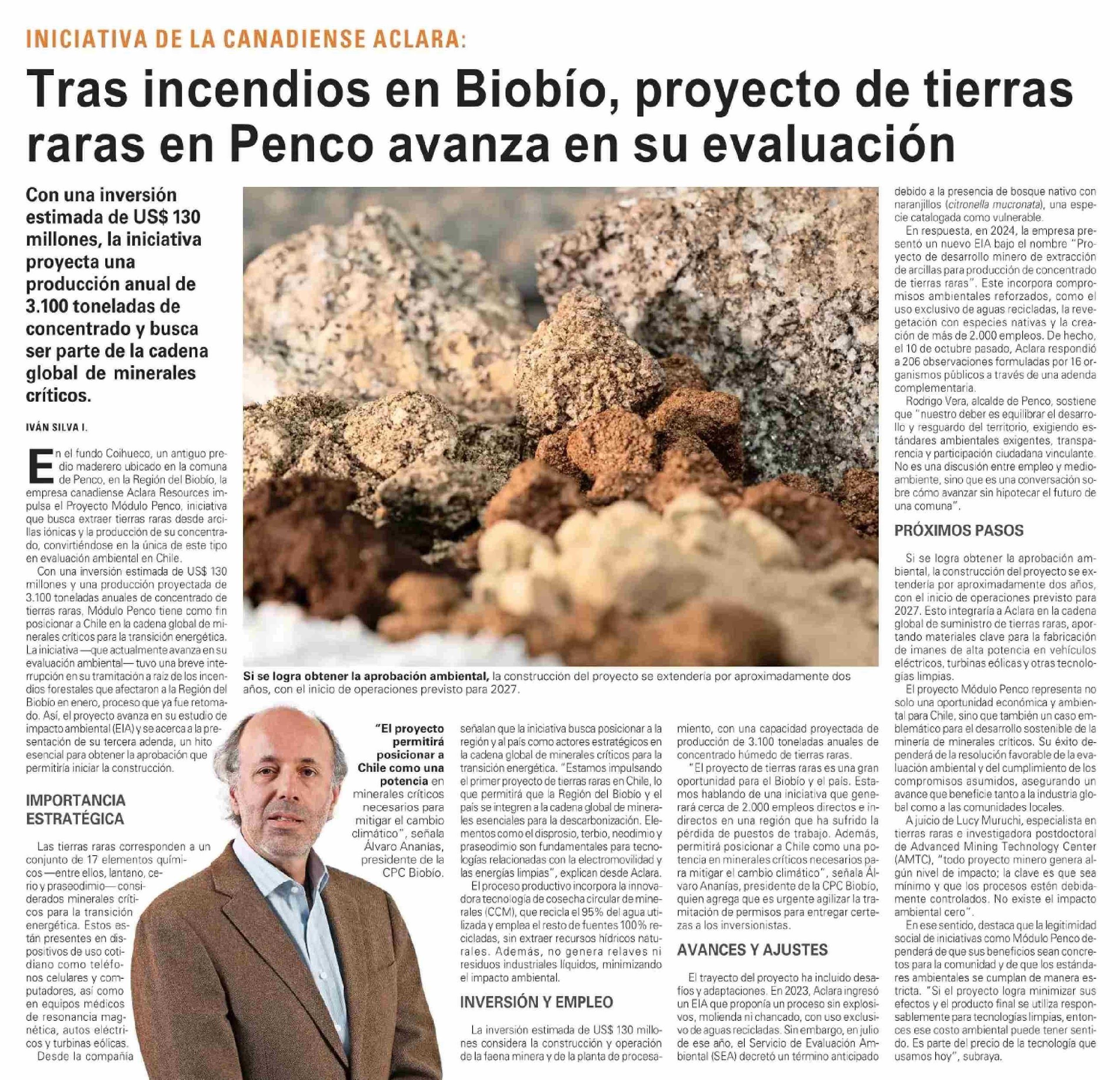 Tras incendios en Biobío, proyecto de tierras raras en Penco avanza en su evaluación 13-02-2026 El Mercurio |