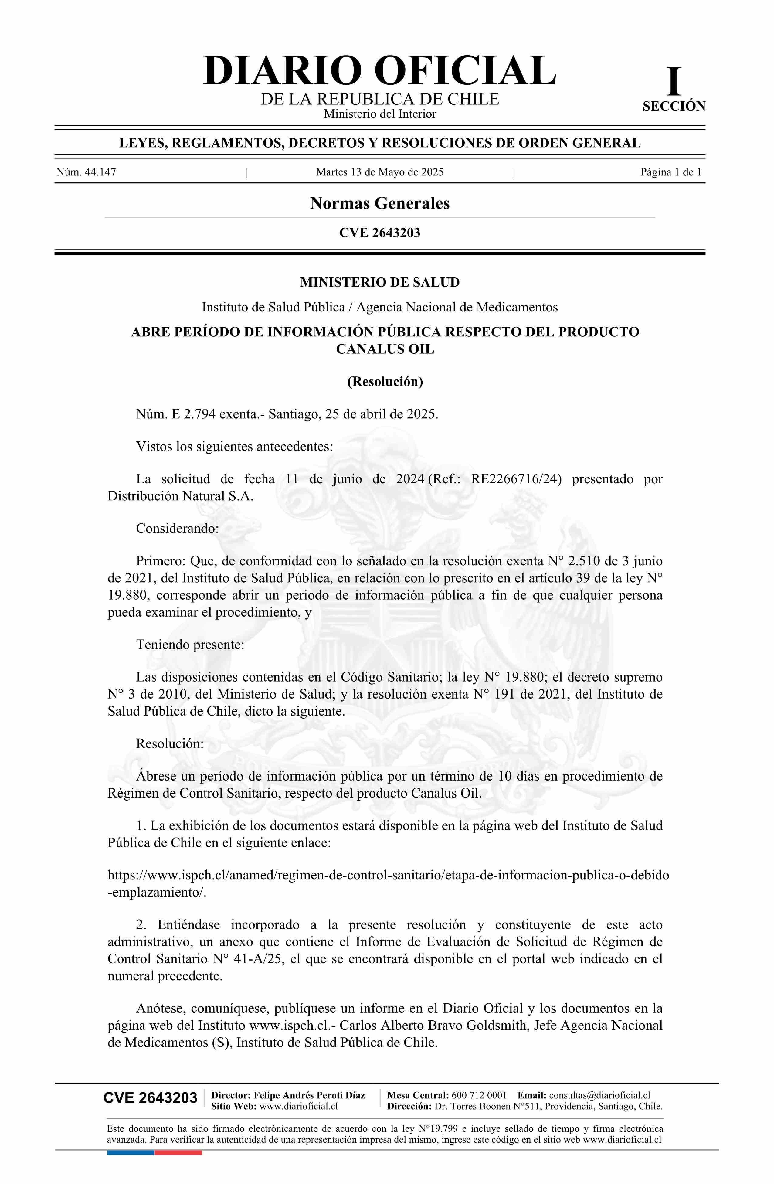 Resolución exenta número E 2.794, de 2025.- Abre período de información pública en procedimiento de Régimen de Control Sanitario, respecto del producto Canalus Oil 13-05-2025 DIARIO OFICIAL CHILE - BOLETÍN OFICIAL DE MINERÍA |