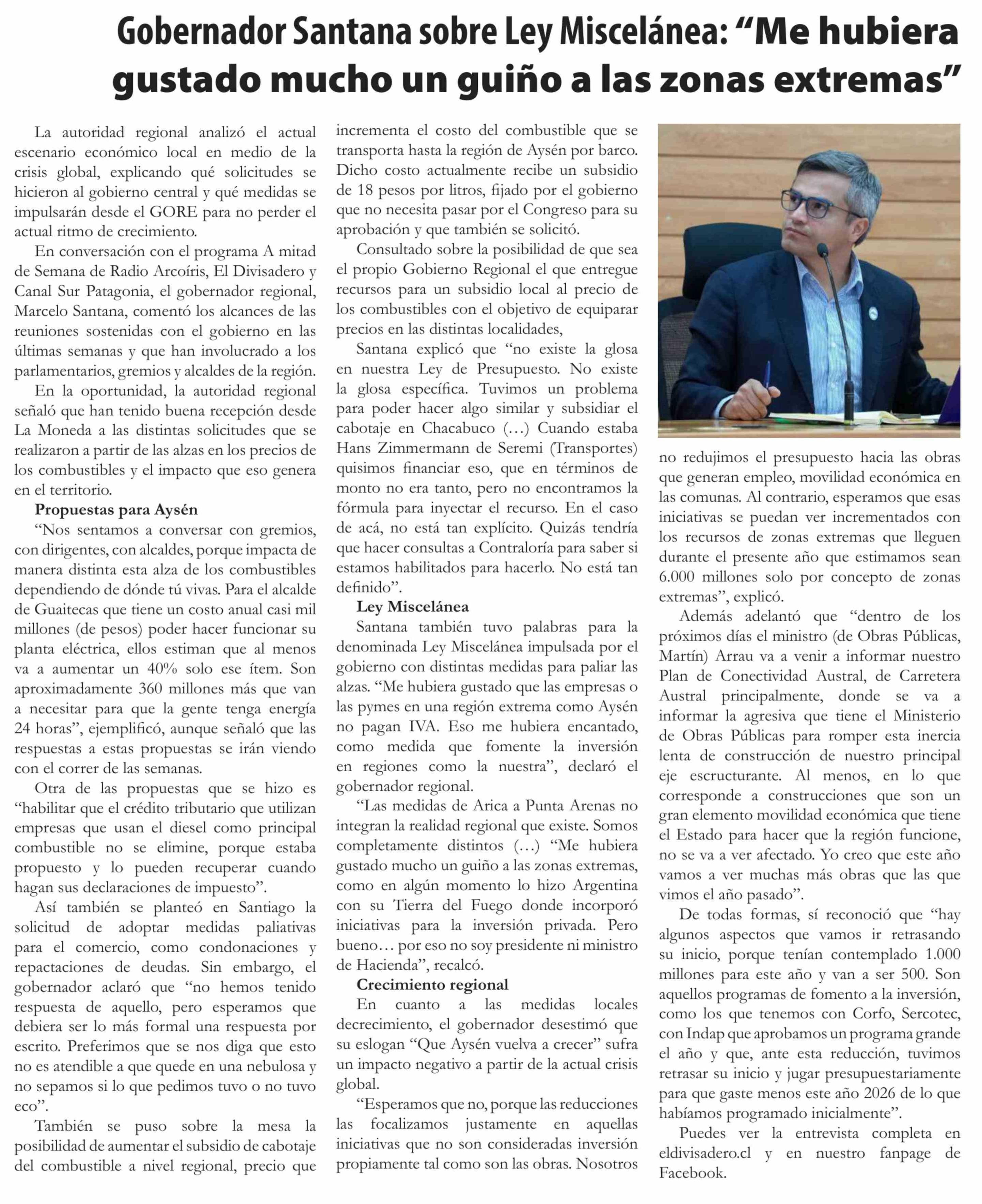 Título: Gobernador Santana sobre Ley Miscelánea: "Me hubiera gustado mucho un guiño a las zonas extremas"