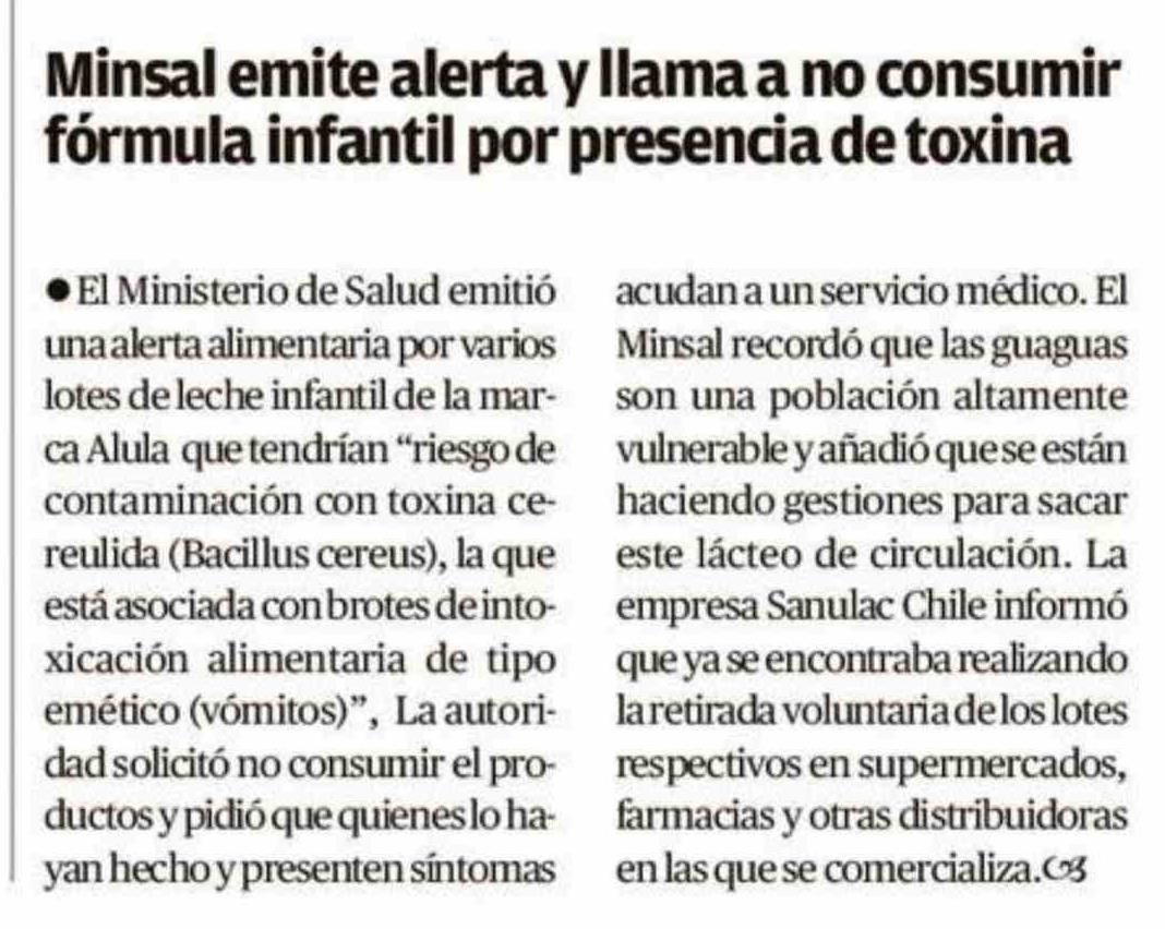 | Título: | Minsal emite alerta y llama a no consumir fórmula infantil por presencia de toxina |