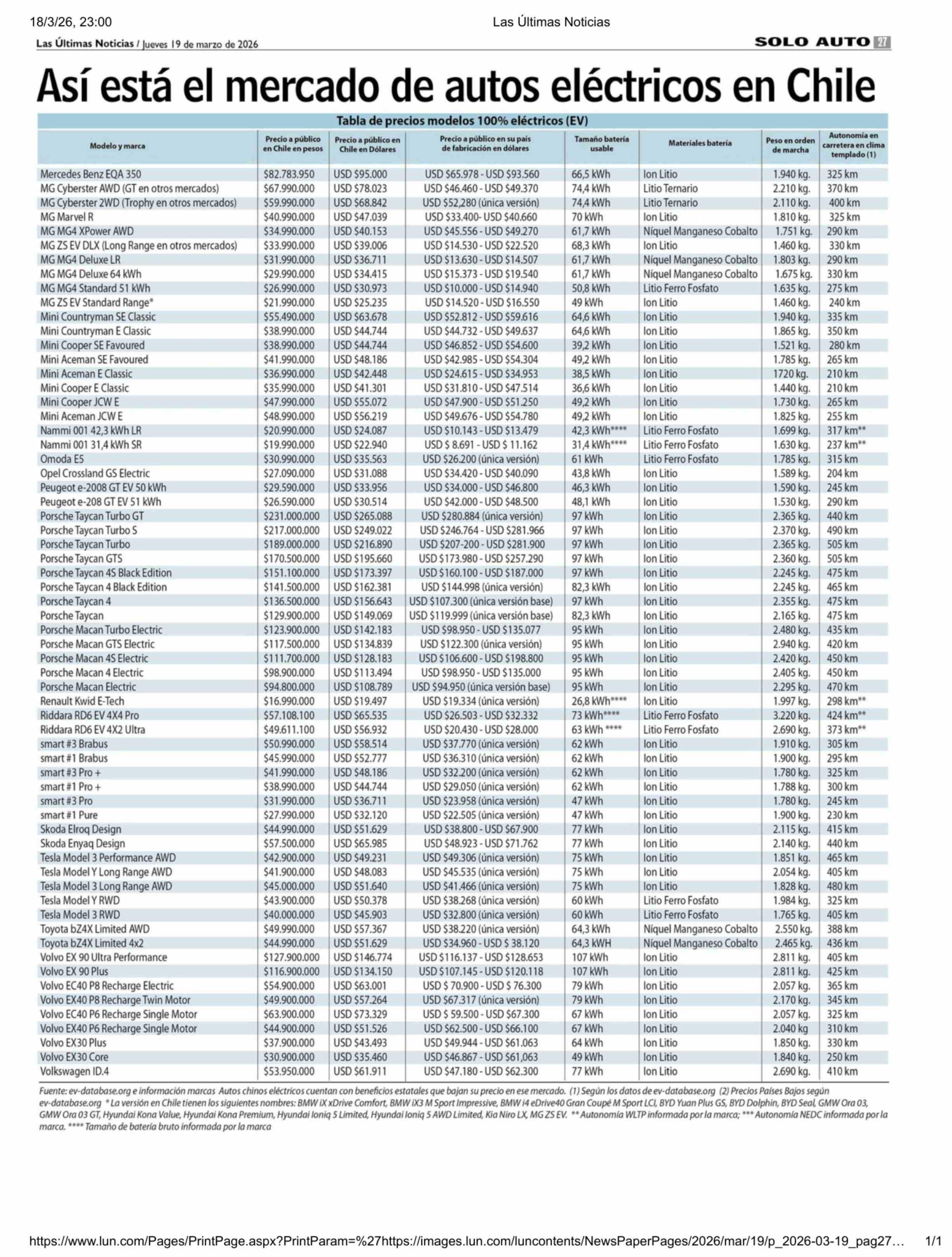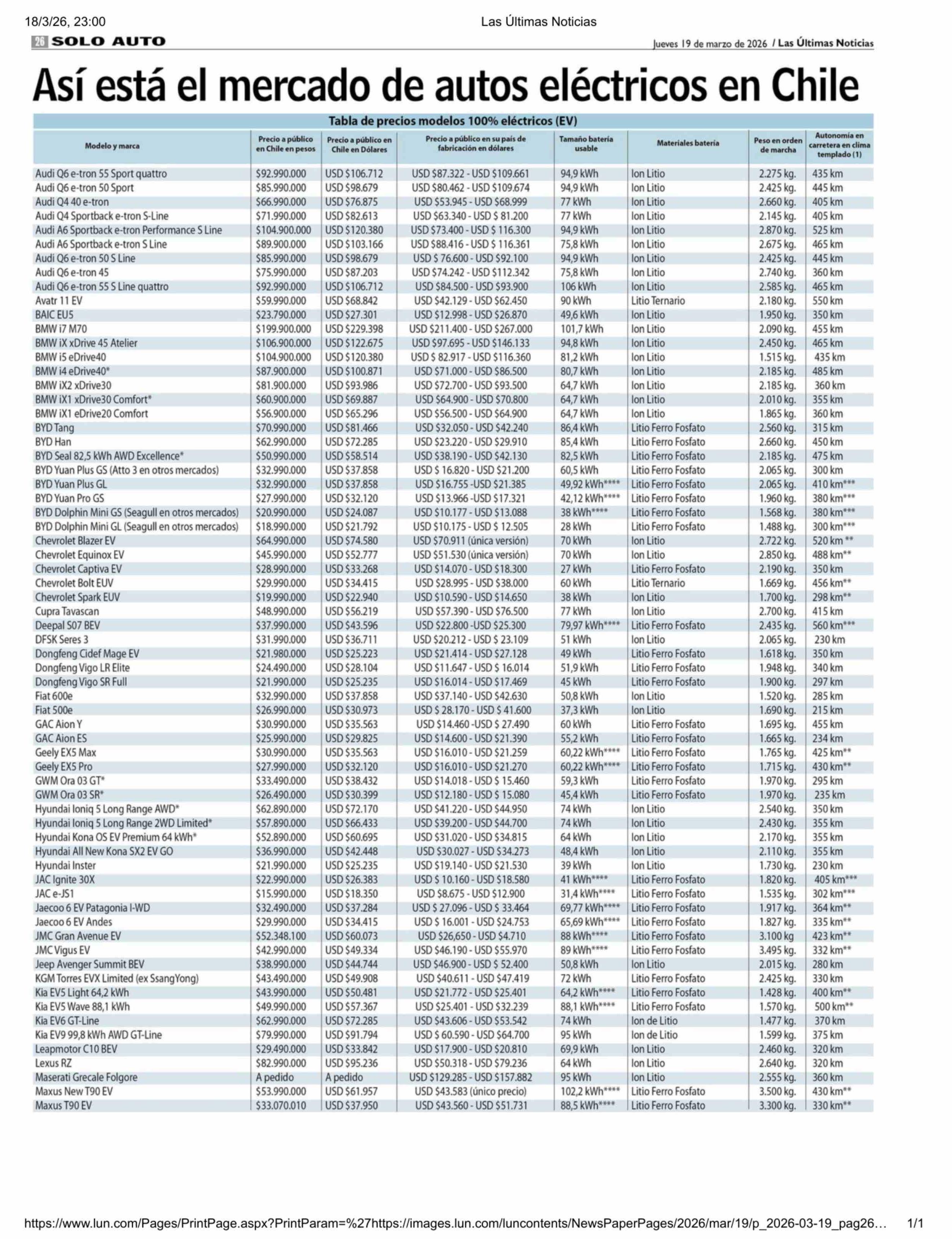 Así está el mercado de autos eléctricos en Chile 19-03-2026 Las Últimas Noticias |