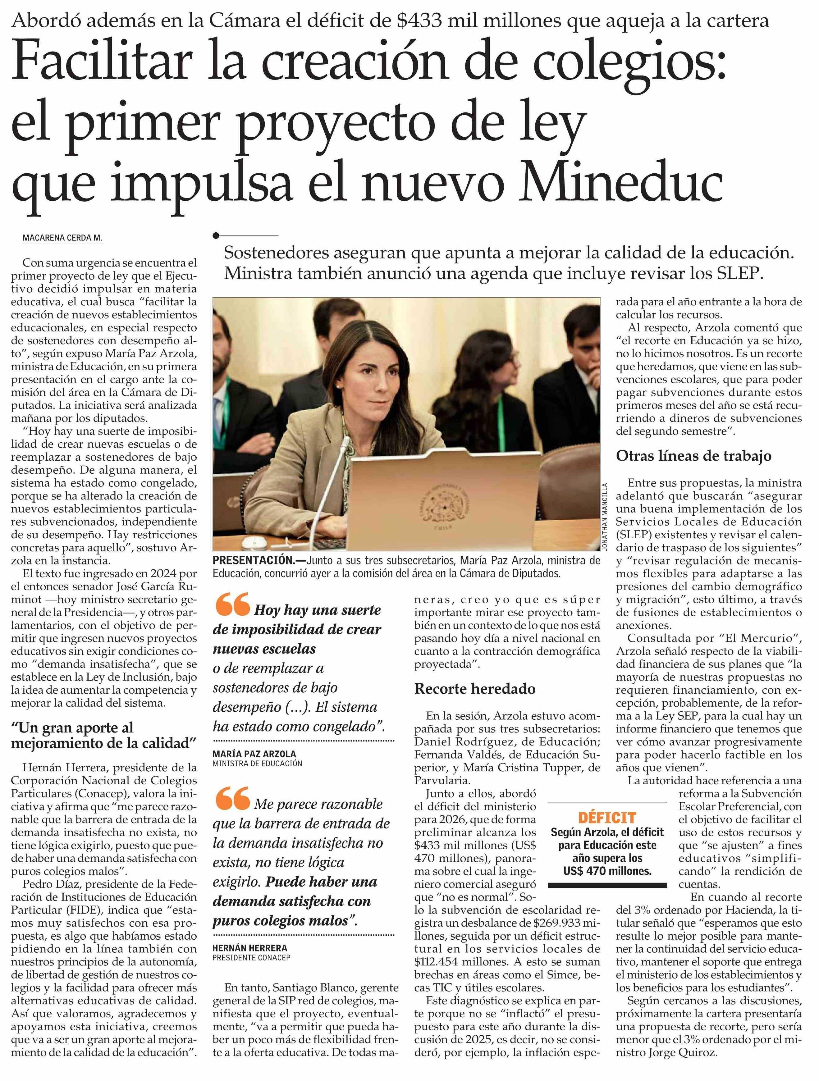 Facilitar la creación de colegios: el primer proyecto de ley que impulsa el nuevo Mineduc 25-03-2026 El Mercurio |