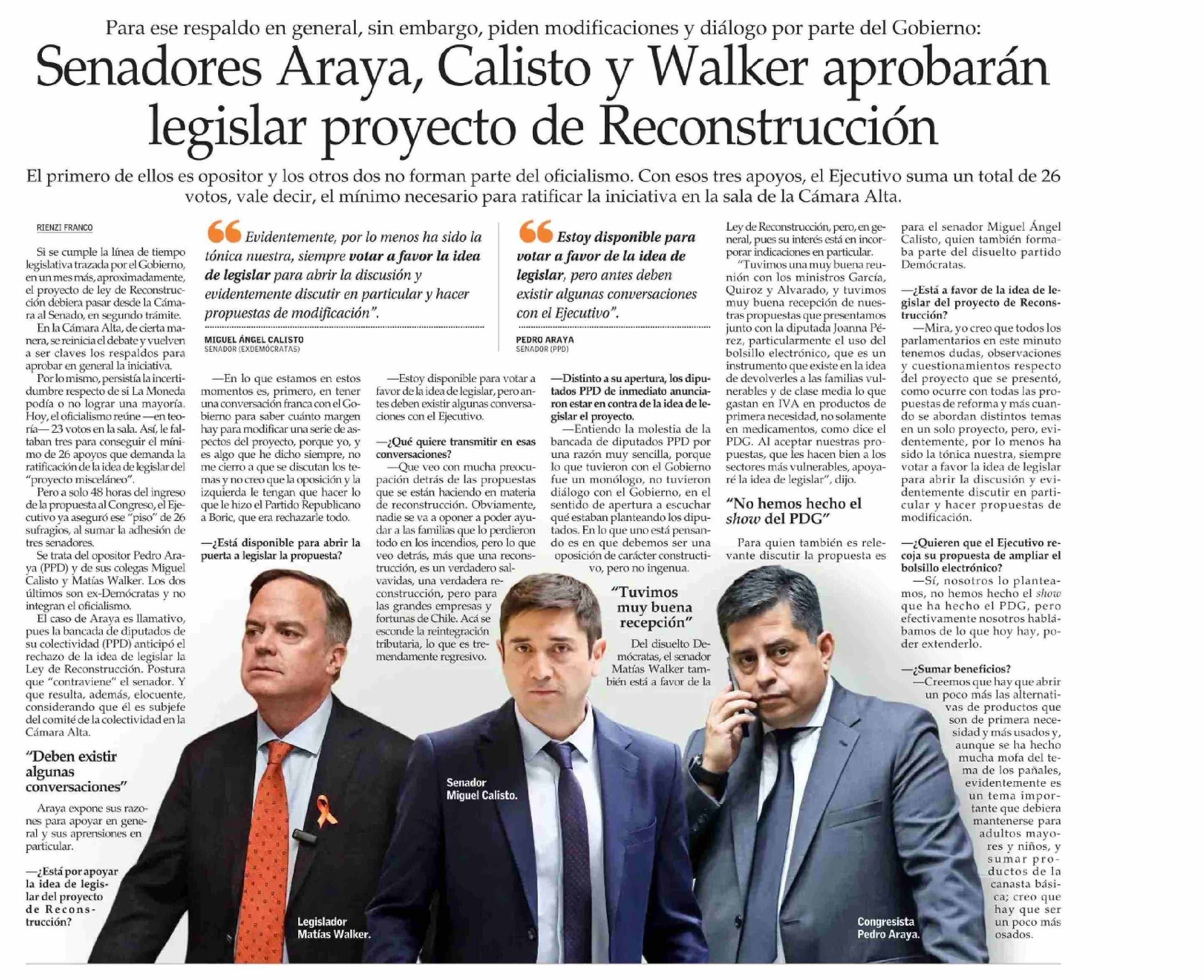 Senadores Araya, Calisto y Walker aprobarán legislar proyecto de Reconstrucción 24-04-2026 El Mercurio |