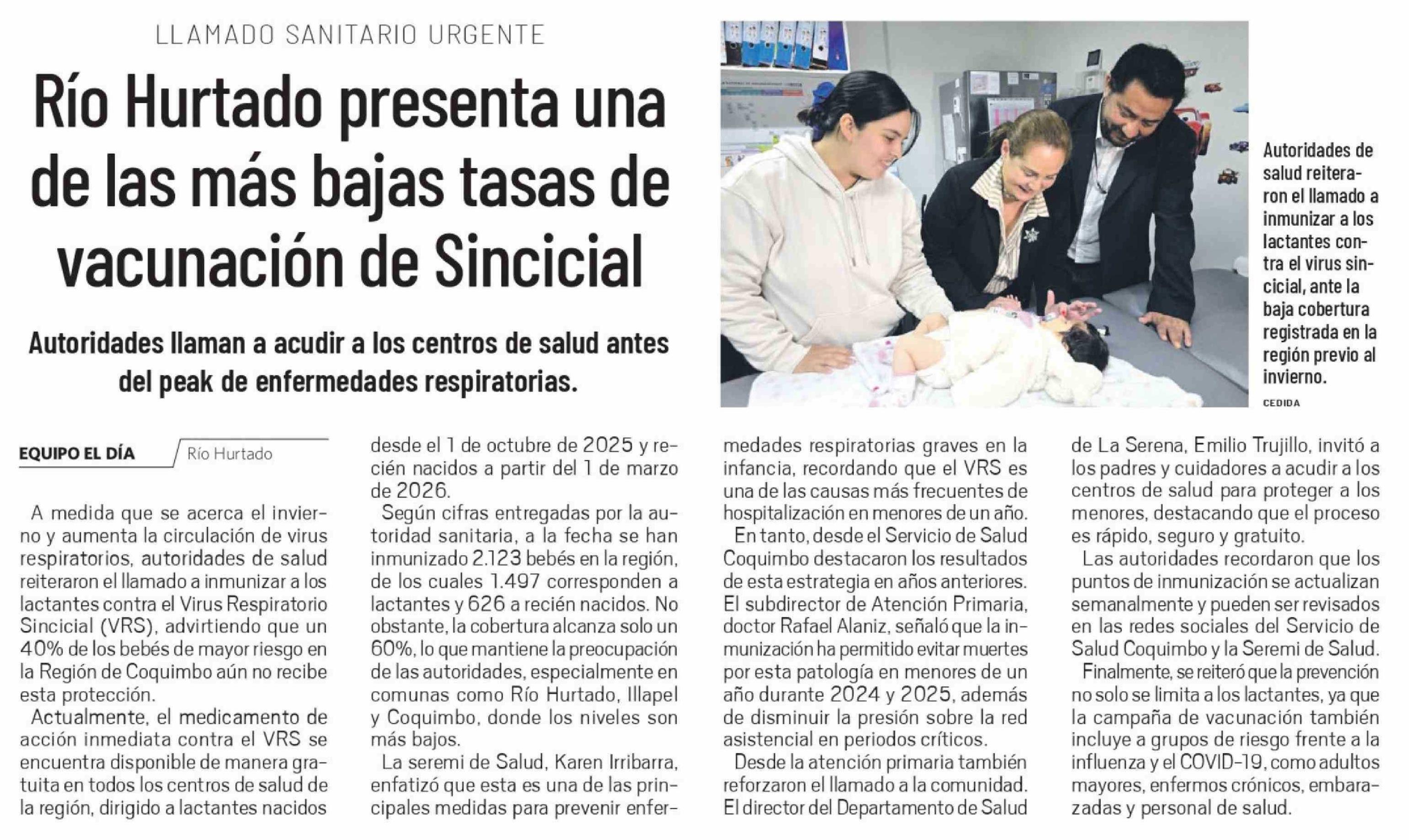 Título: Río Hurtado presenta una de las más bajas tasas de vacunación de Sincicial