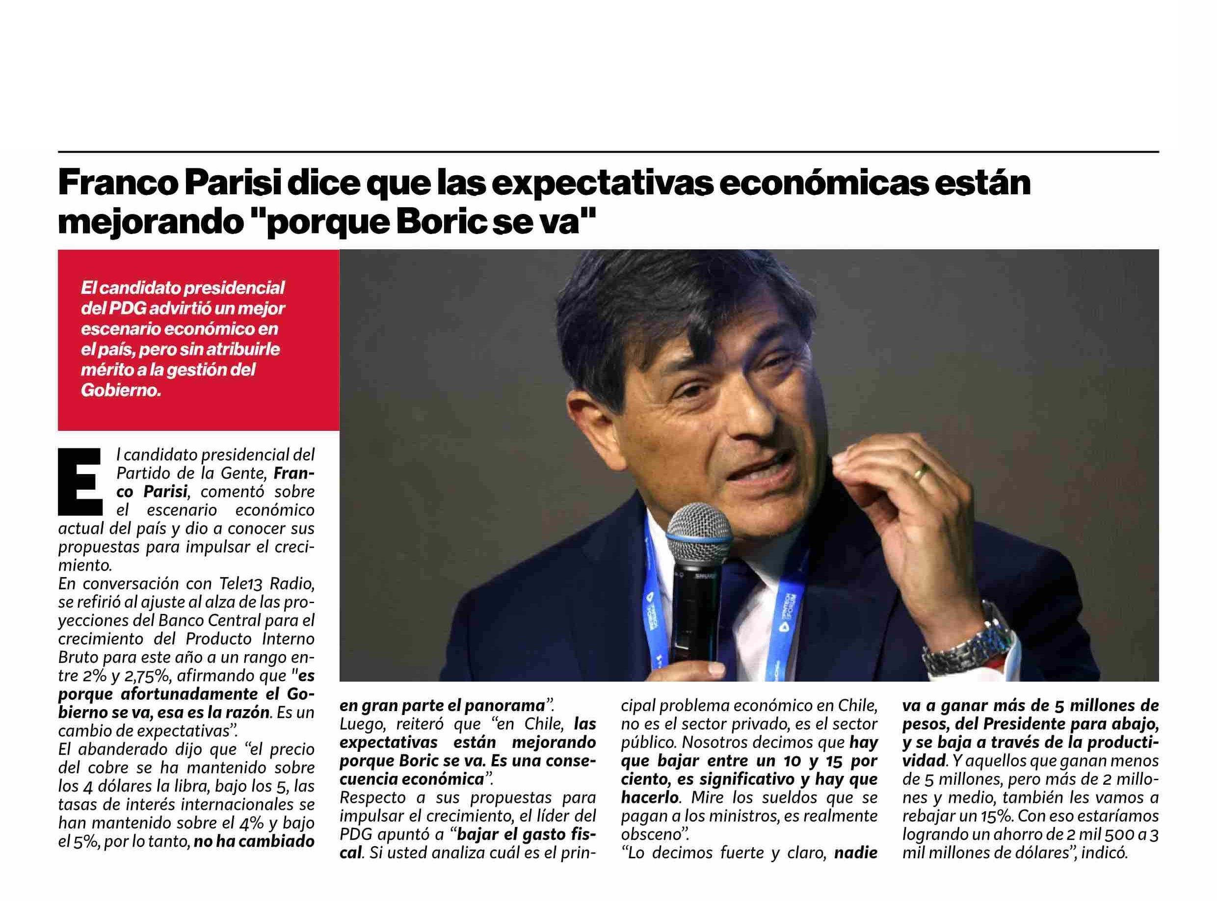 Franco Parisi dice que las expectativas económicas están mejorando “porque Boric se va” 19-06-2025 Puranoticia.cl |