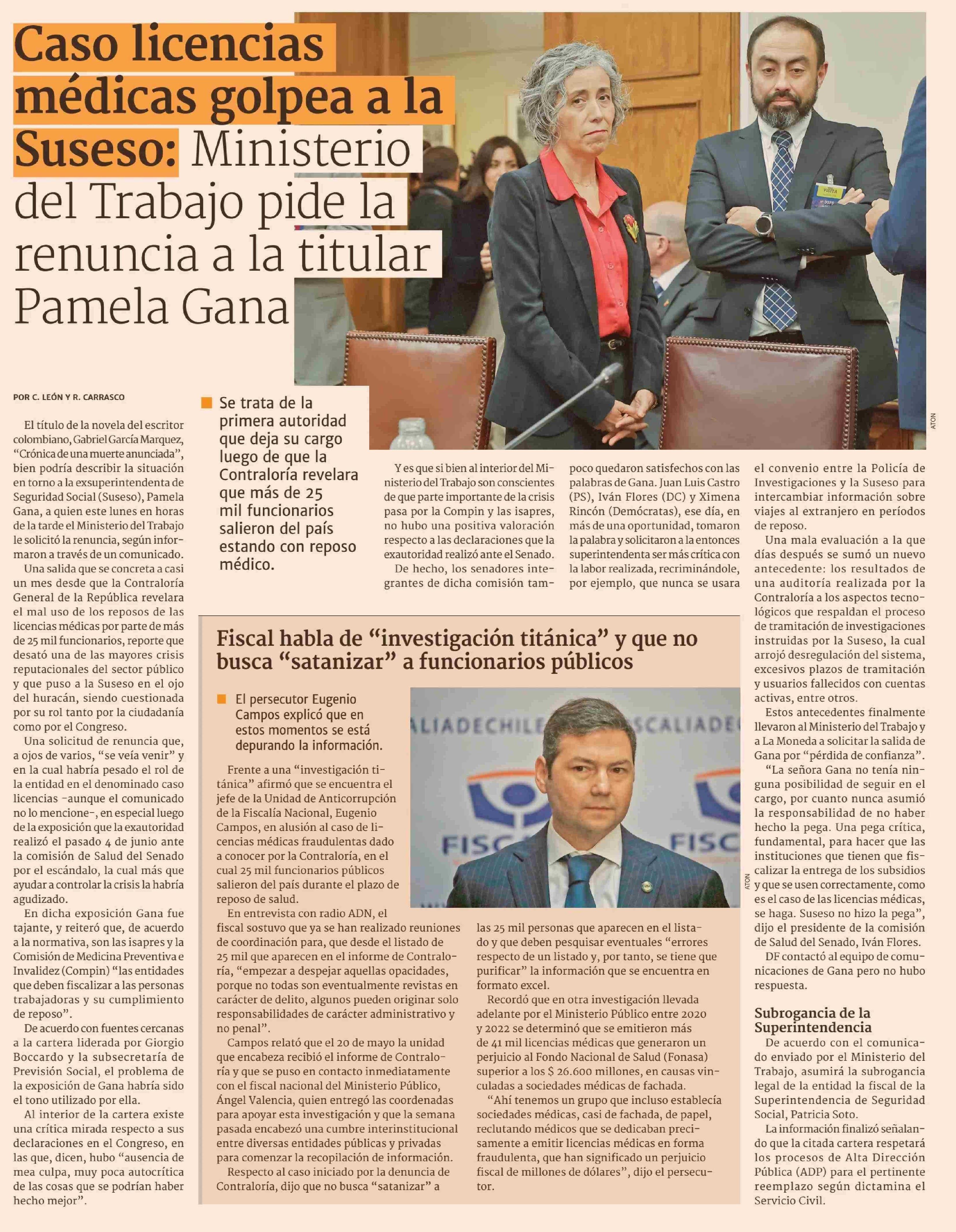 Caso licencias médicas golpea a la Suseso: Ministerio del Trabajo pide la renuncia a la titular Pamela Gana 17-06-2025 Diario Financiero |