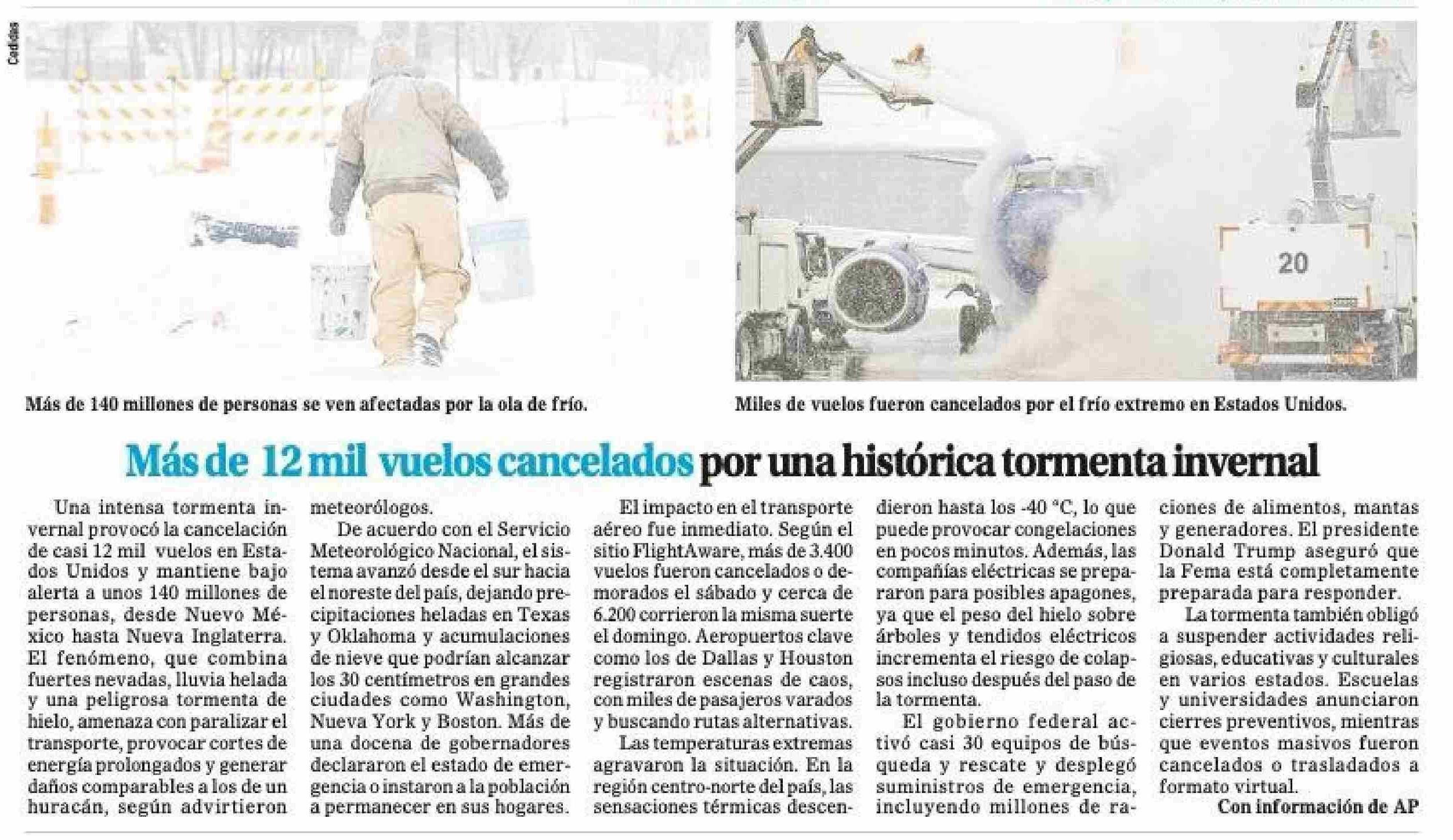 Más de 12 mil vuelos cancelados por una histórica tormenta invernal 25-01-2026 El Magallanes |