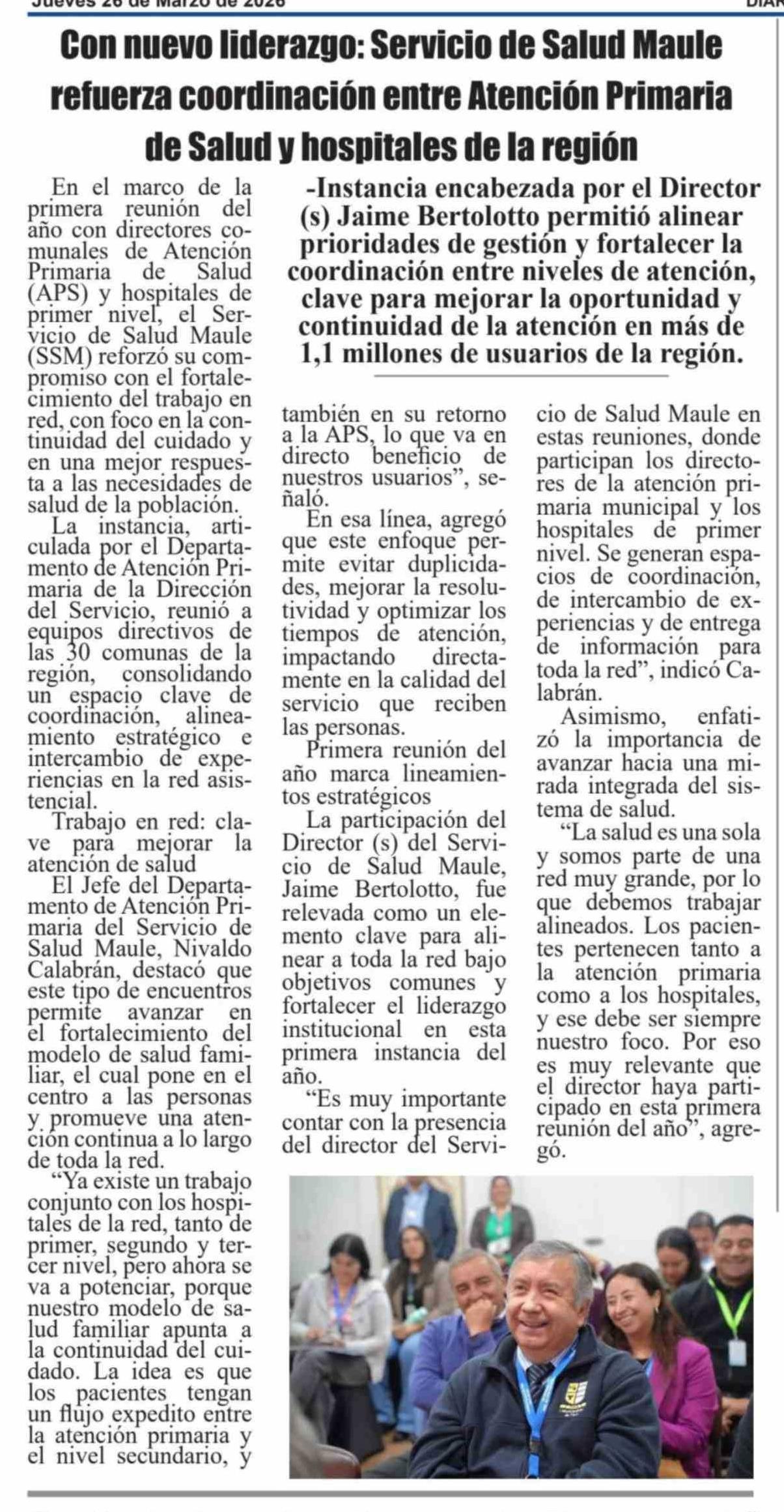 Con nuevo liderazgo: Servicio de Salud Maule refuerza coordinación entre Atención Primaria de Salud y hospitales de la región 26-03-2026 El Heraldo |